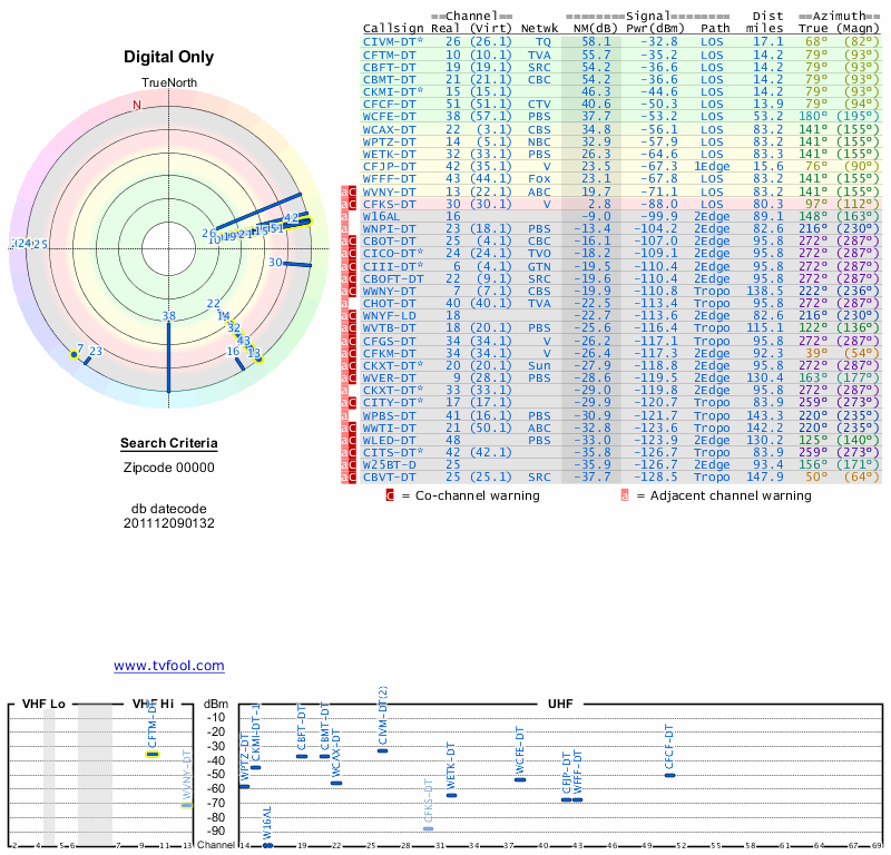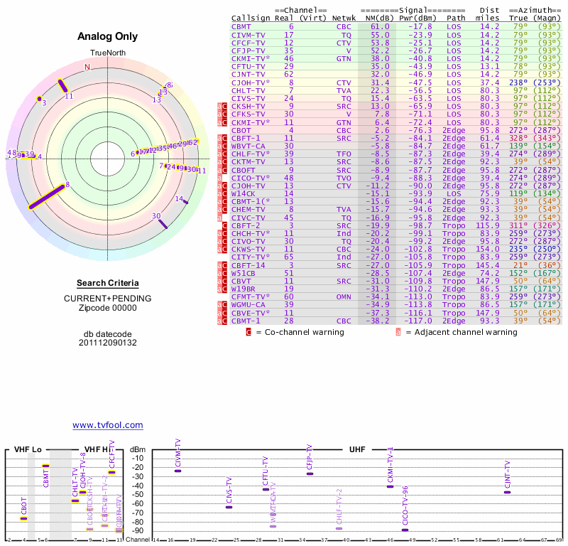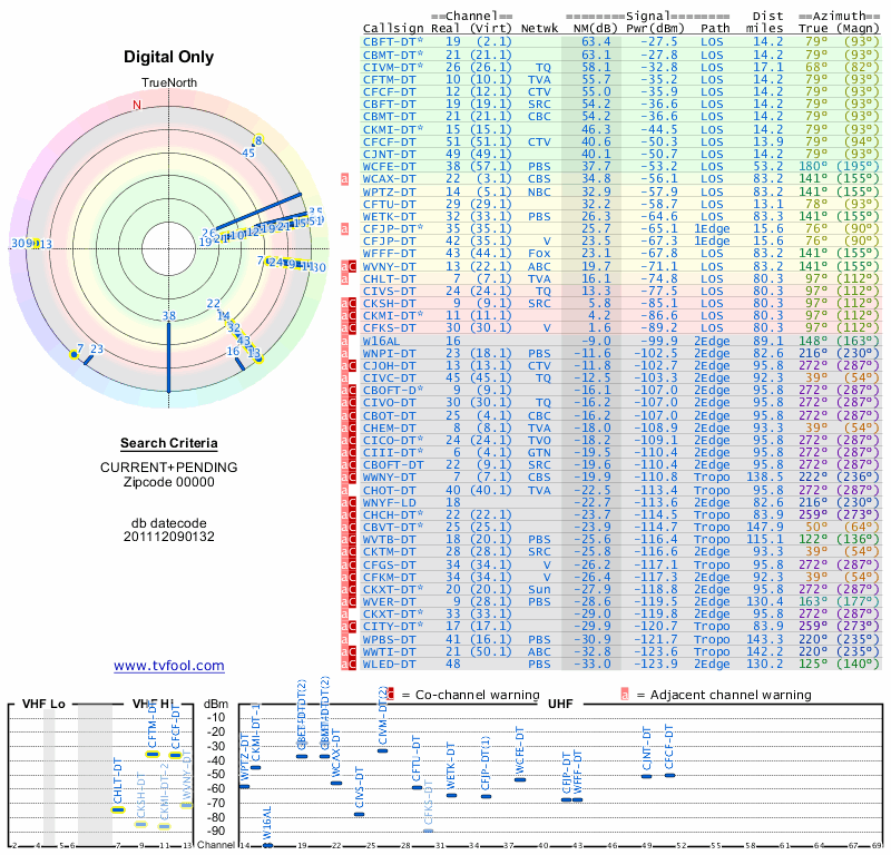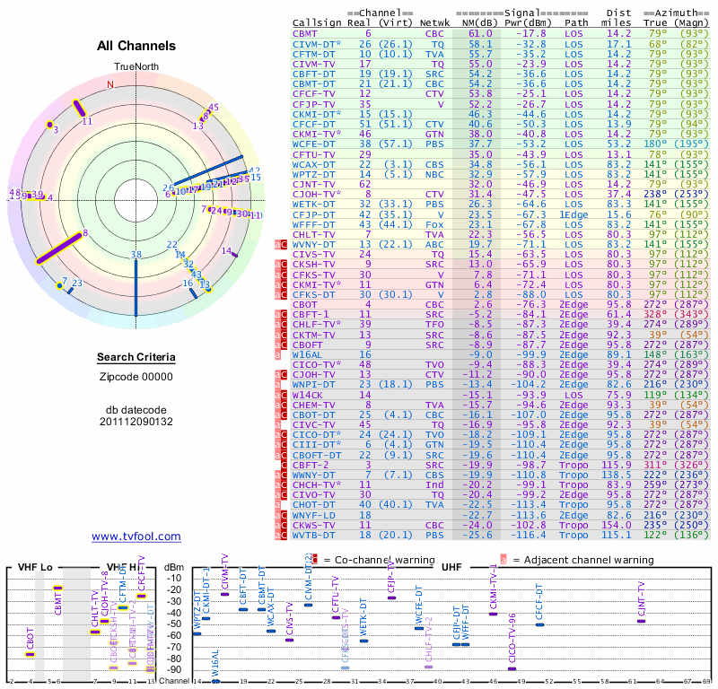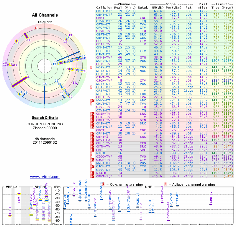 Here are the results for your location. The transmitter database was last updated on June 7, 2013. For more information about these plots and how to interpret them, please check out the Signal Analysis FAQ.