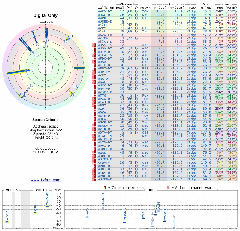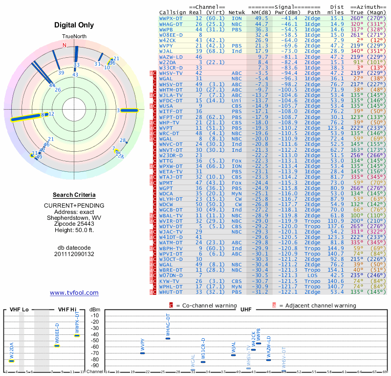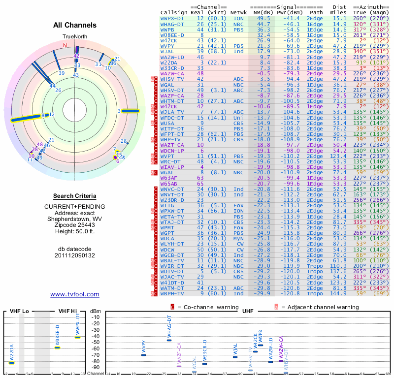 Here are the results for your location. The transmitter database was last updated on June 7, 2013. For more information about these plots and how to interpret them, please check out the Signal Analysis FAQ.
