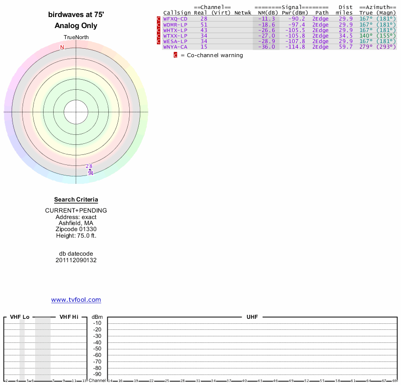 Here are the results for your location. The transmitter database was last updated on June 7, 2013. For more information about these plots and how to interpret them, please check out the Signal Analysis FAQ.