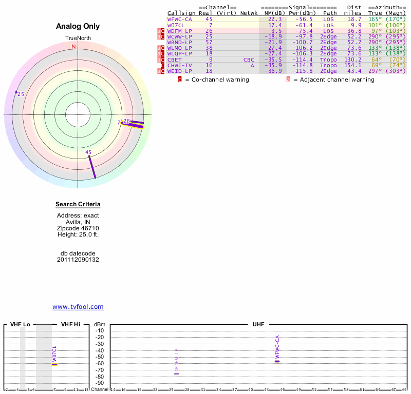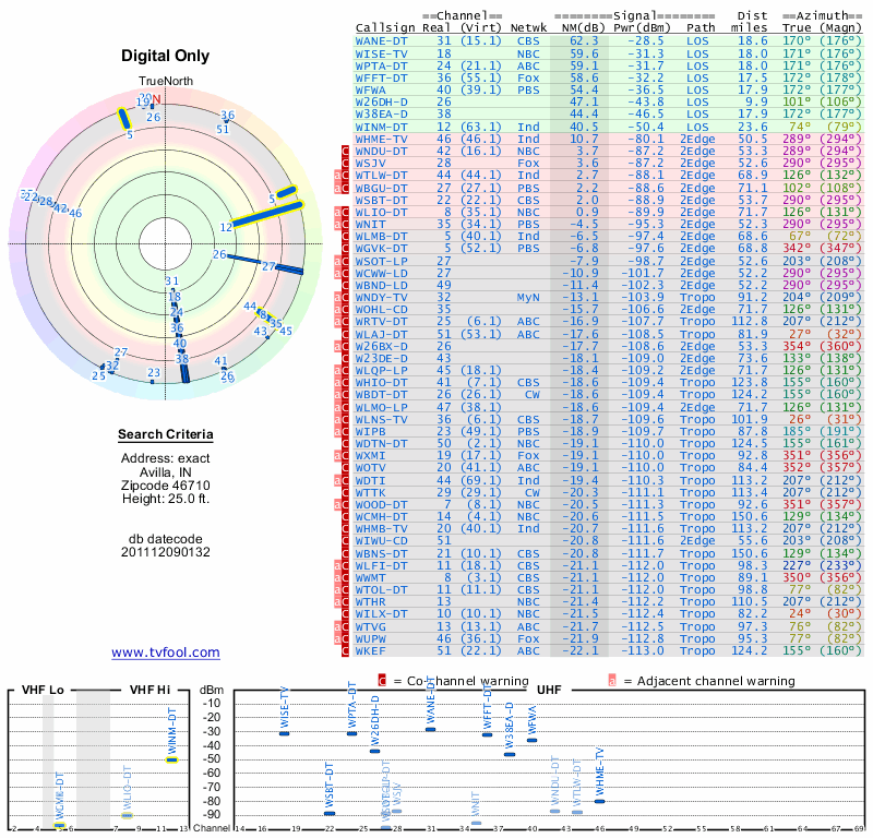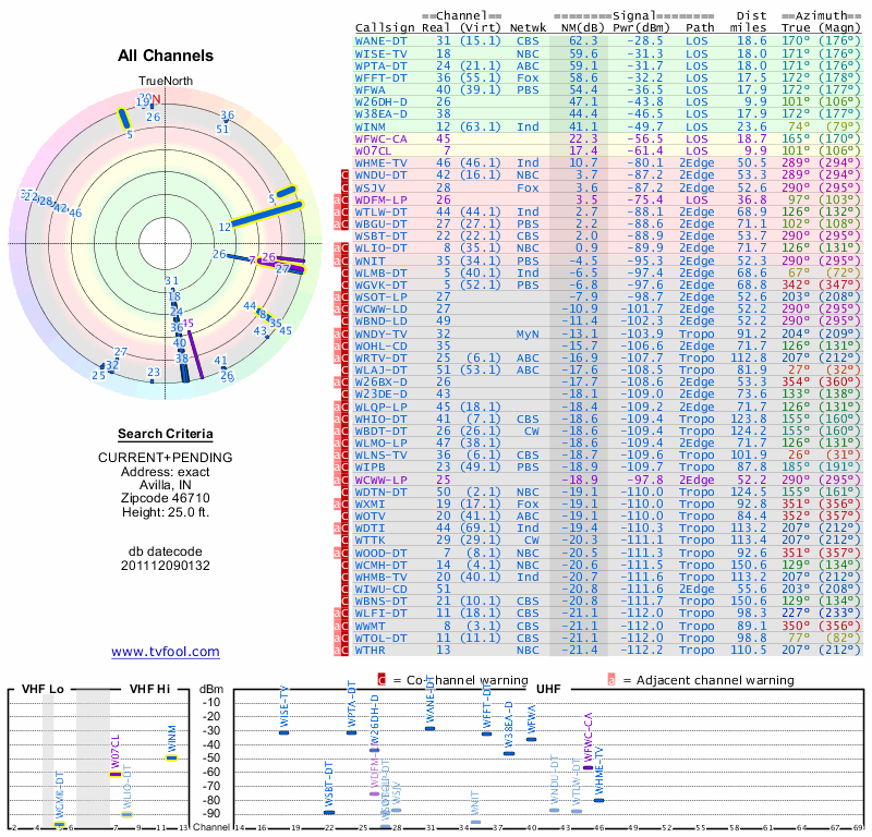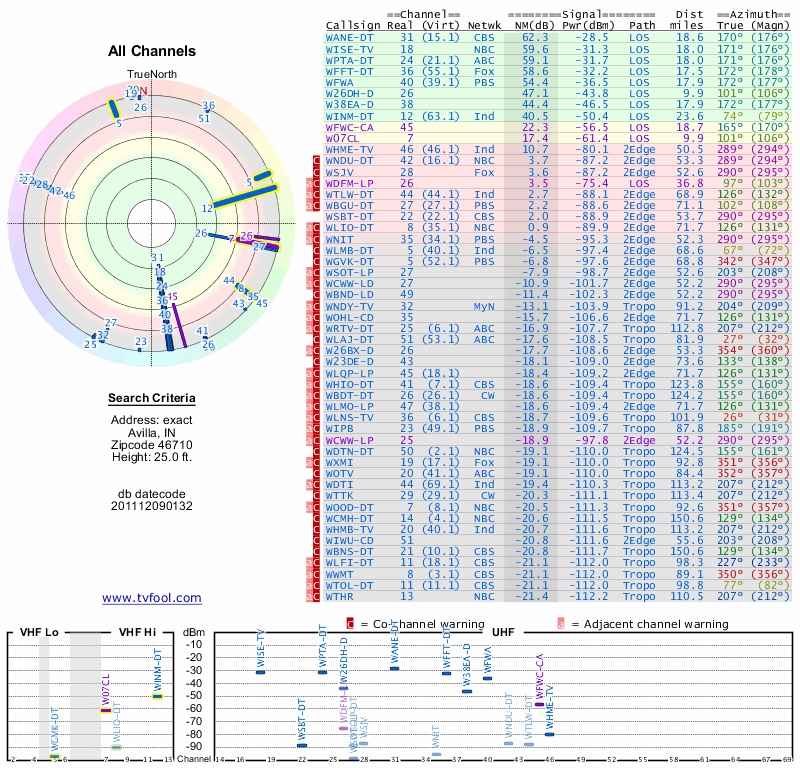 Here are the results for your location. The transmitter database was last updated on June 7, 2013. For more information about these plots and how to interpret them, please check out the Signal Analysis FAQ.