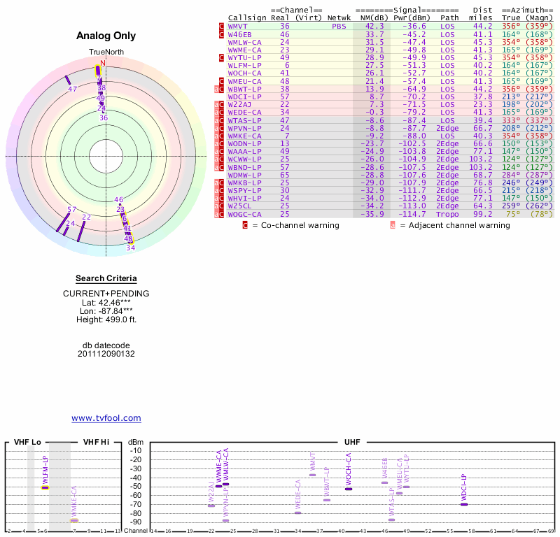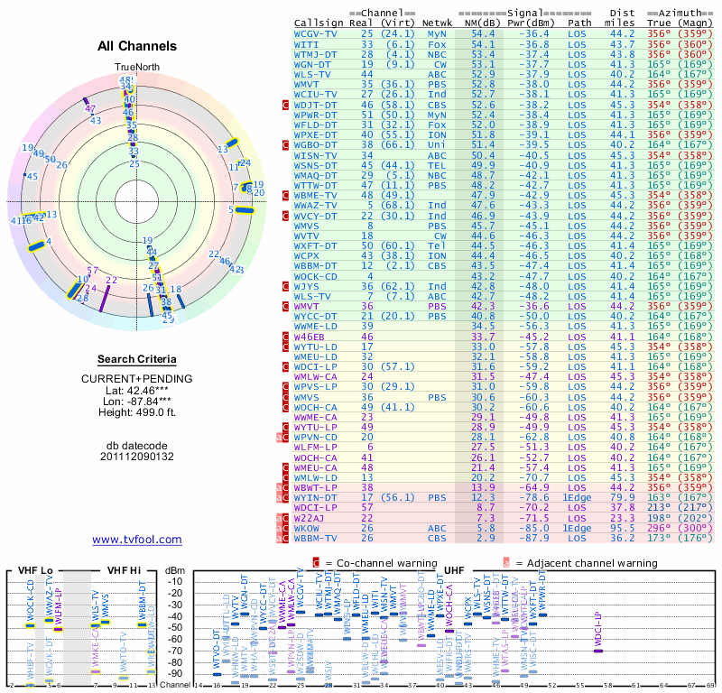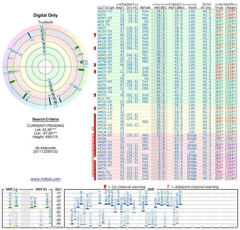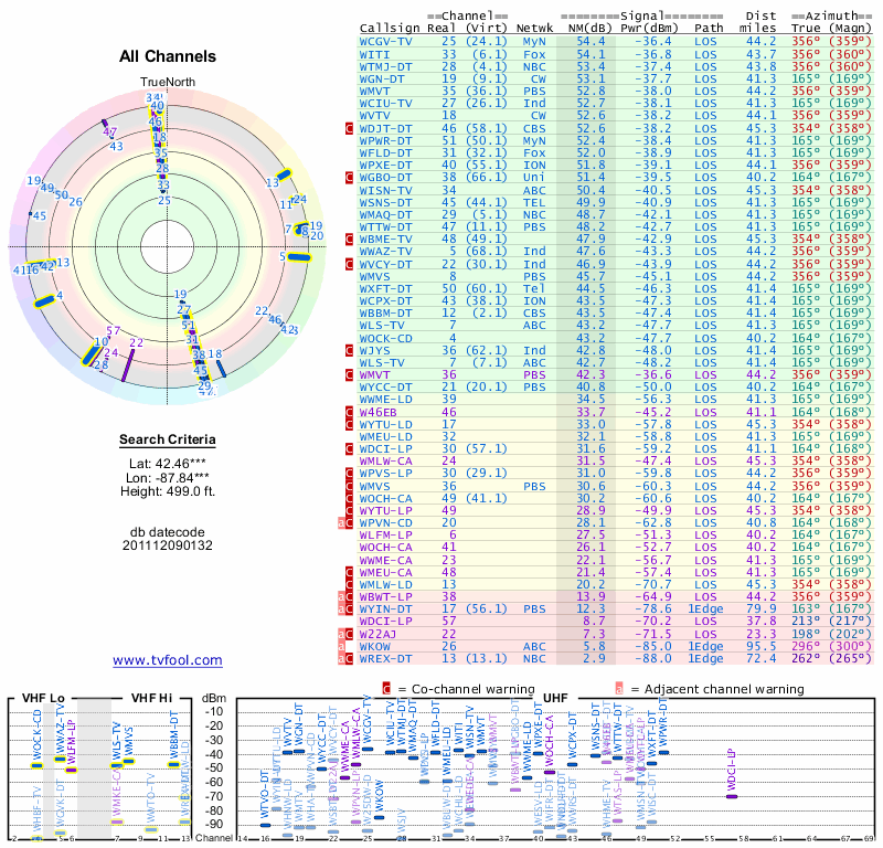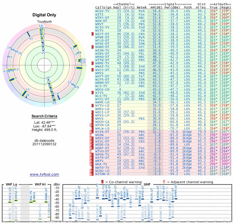 Here are the results for your location. The transmitter database was last updated on June 7, 2013. For more information about these plots and how to interpret them, please check out the Signal Analysis FAQ.