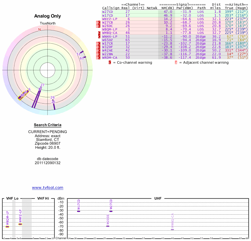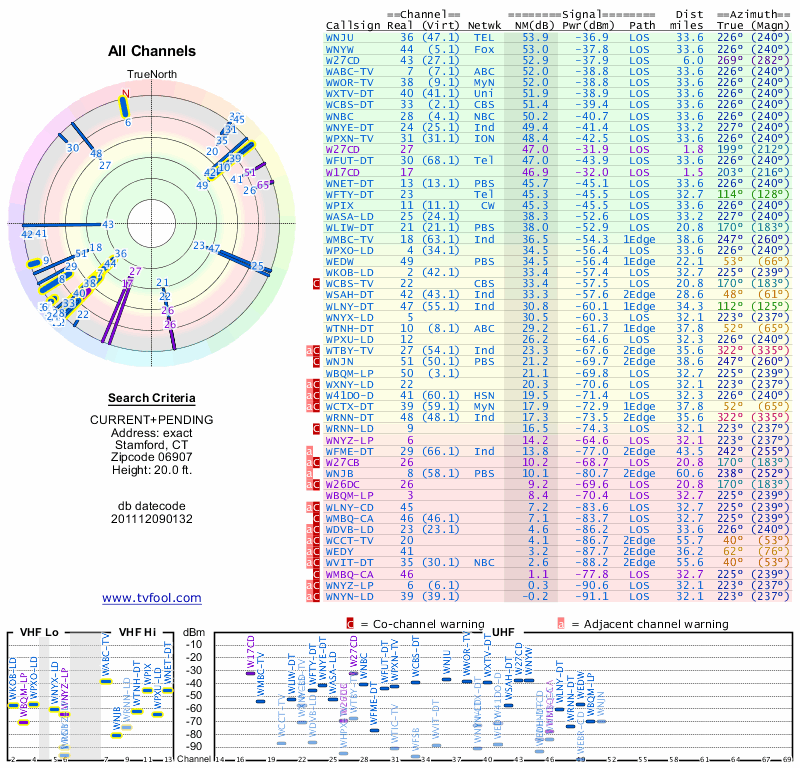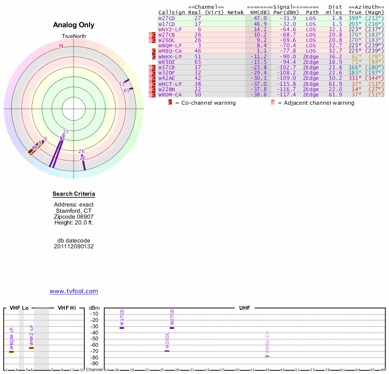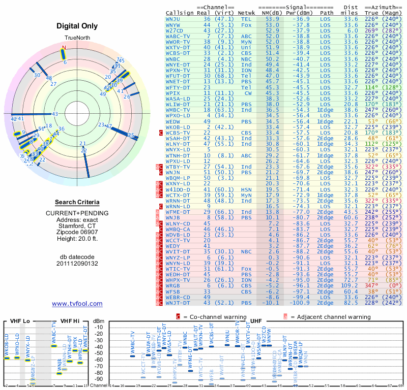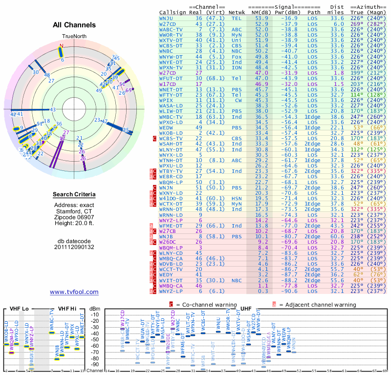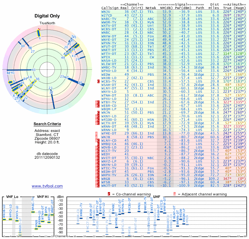 Here are the results for your location. The transmitter database was last updated on June 7, 2013. For more information about these plots and how to interpret them, please check out the Signal Analysis FAQ.