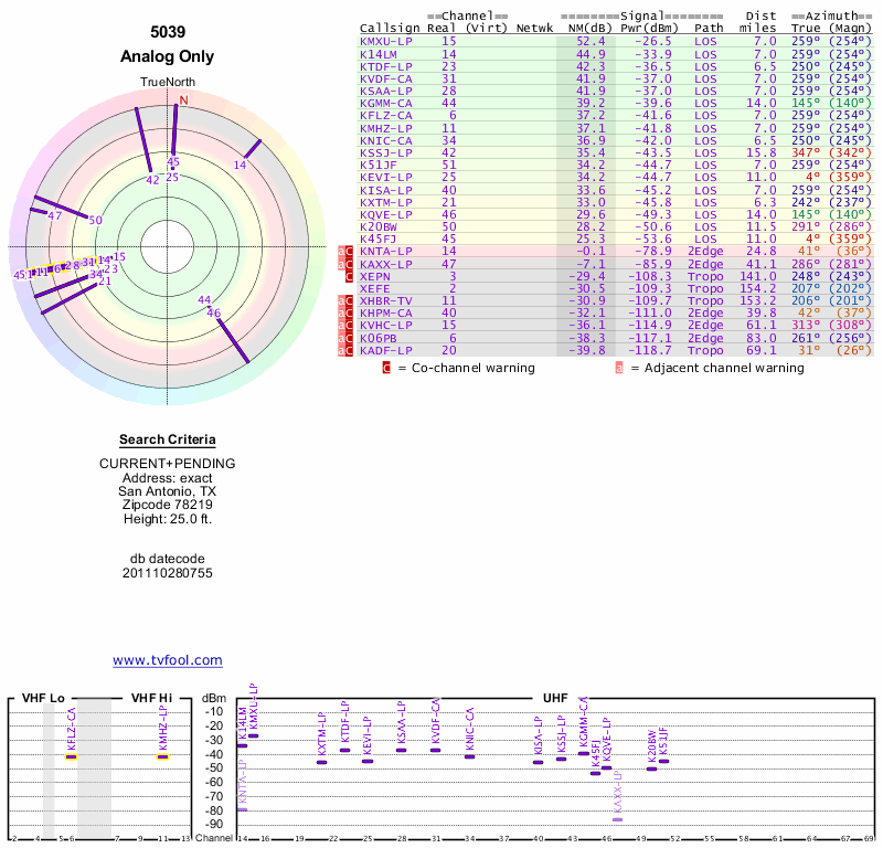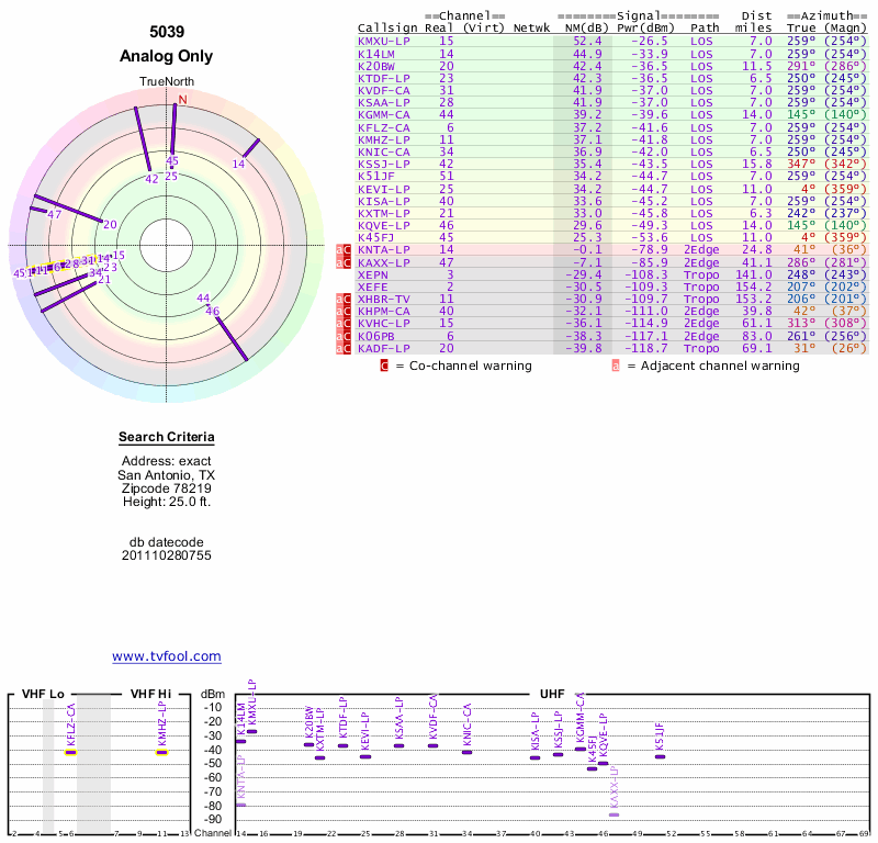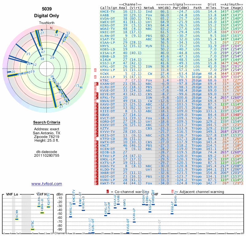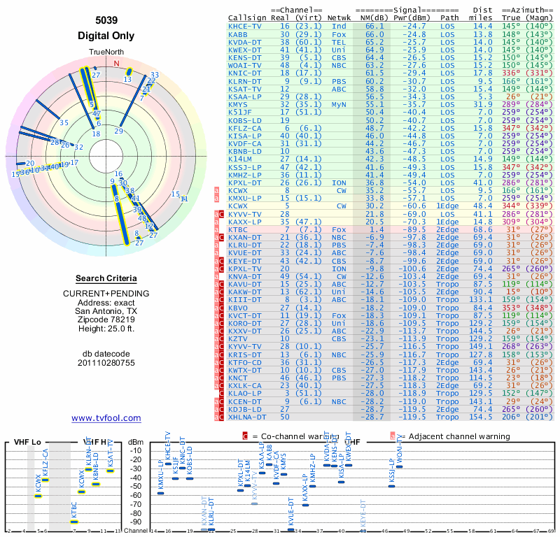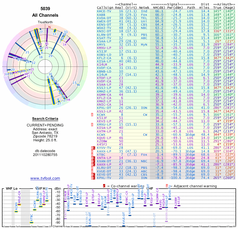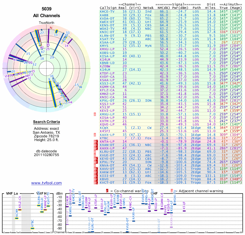 Here are the results for your location. The transmitter database was last updated on June 7, 2013. For more information about these plots and how to interpret them, please check out the Signal Analysis FAQ.