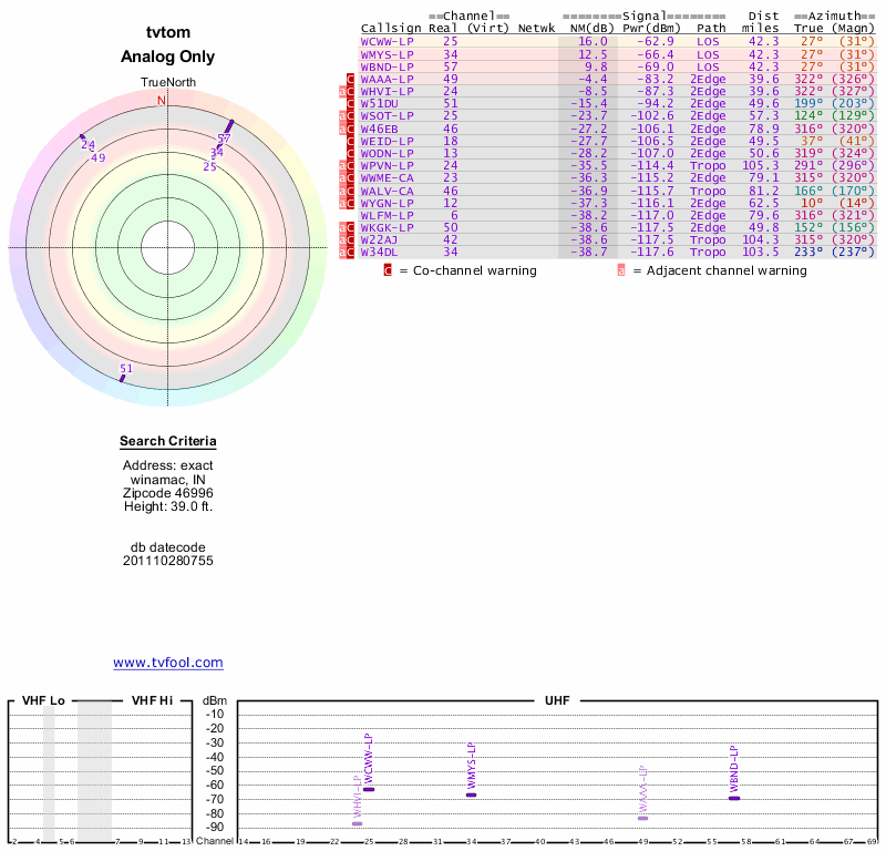 Here are the results for your location. The transmitter database was last updated on June 7, 2013. For more information about these plots and how to interpret them, please check out the Signal Analysis FAQ.