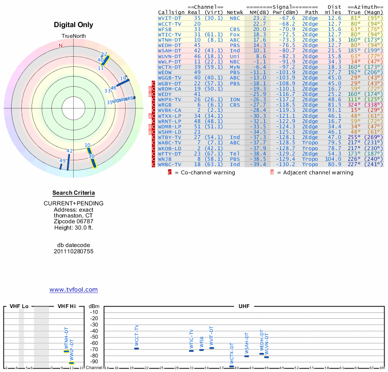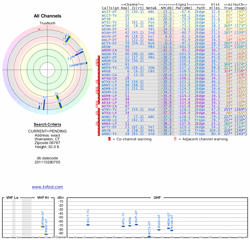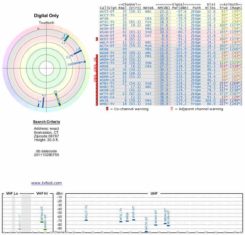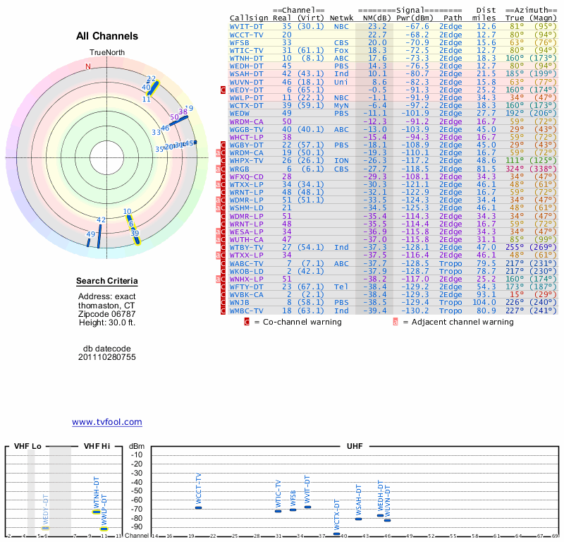 Here are the results for your location. The transmitter database was last updated on June 7, 2013. For more information about these plots and how to interpret them, please check out the Signal Analysis FAQ.