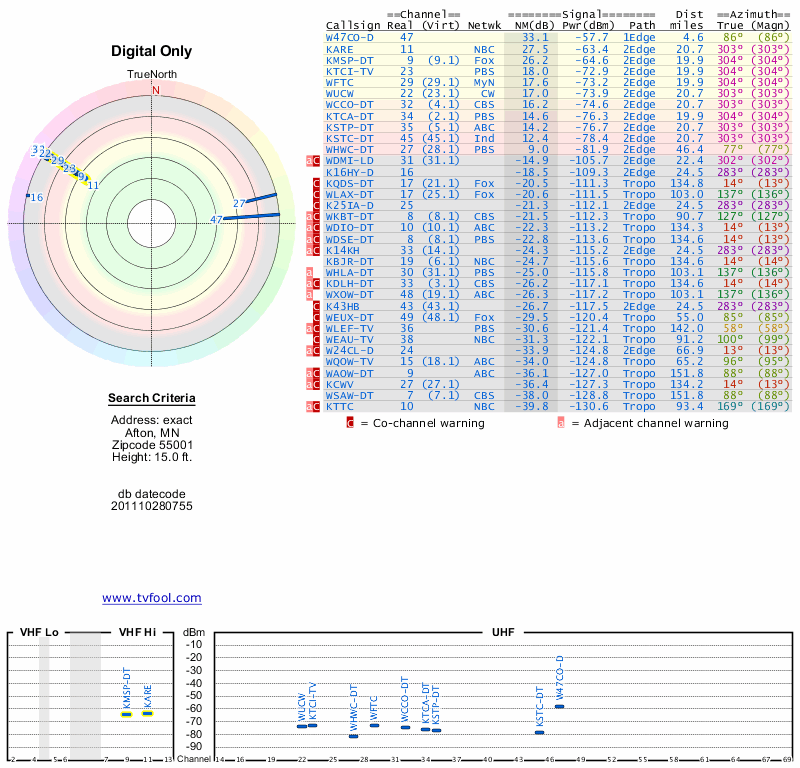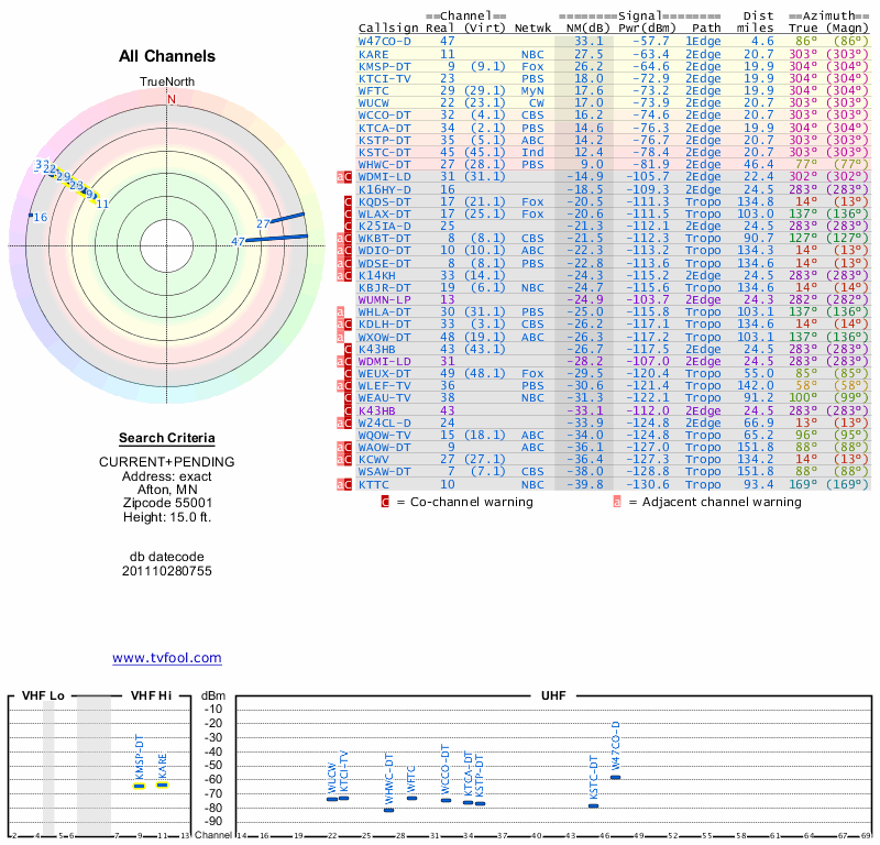 Here are the results for your location. The transmitter database was last updated on June 7, 2013. For more information about these plots and how to interpret them, please check out the Signal Analysis FAQ.