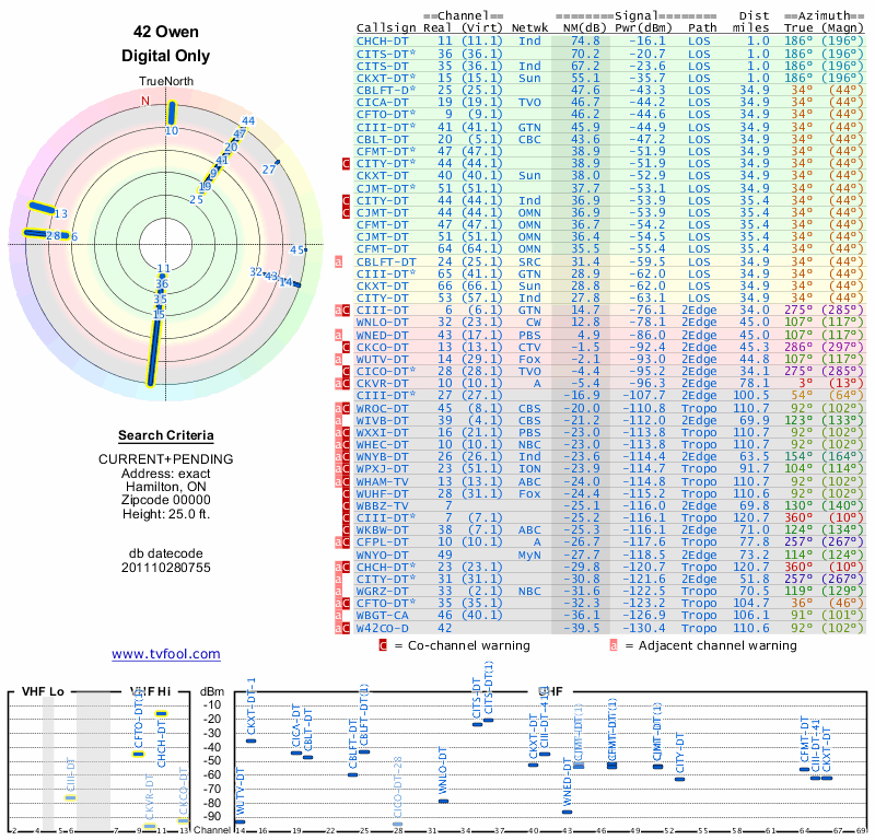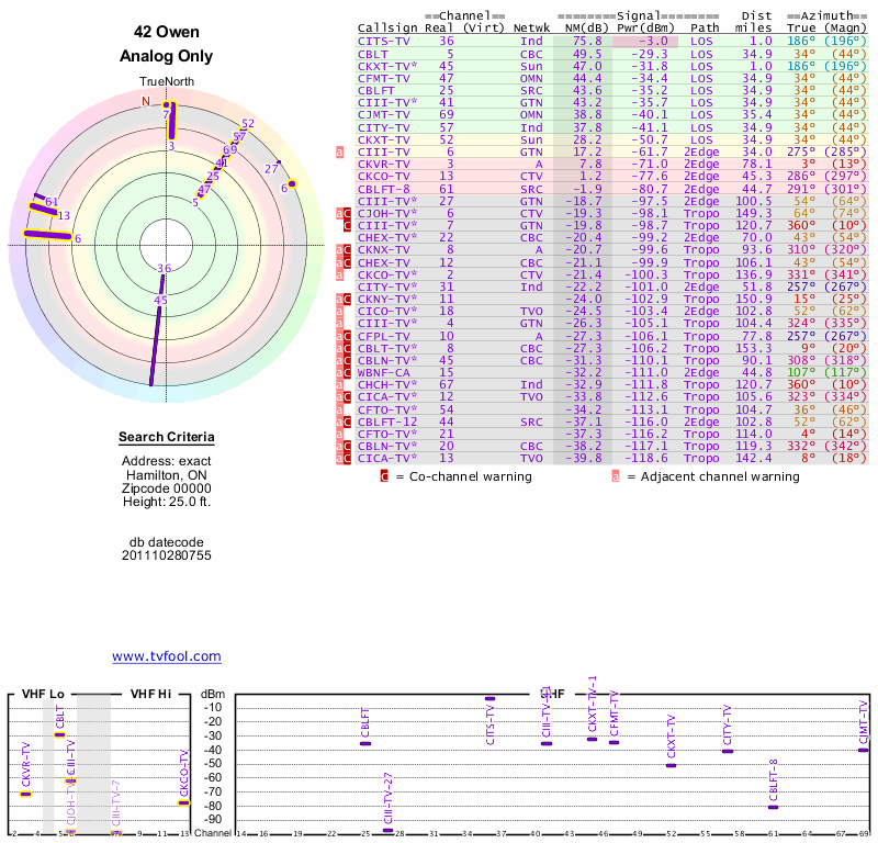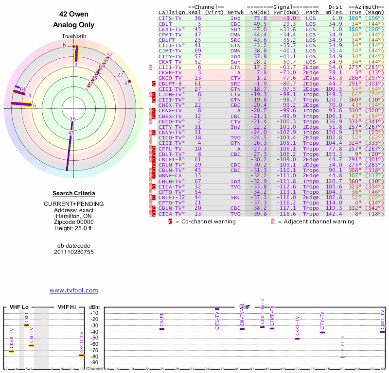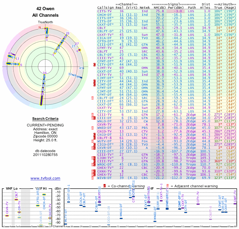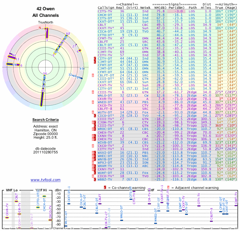 Here are the results for your location. The transmitter database was last updated on June 7, 2013. For more information about these plots and how to interpret them, please check out the Signal Analysis FAQ.