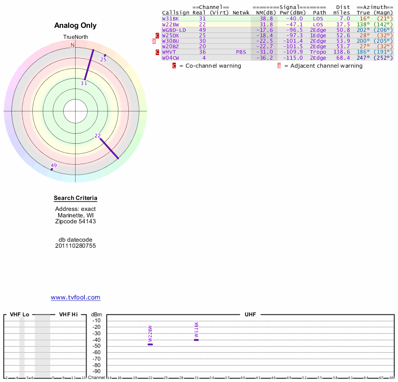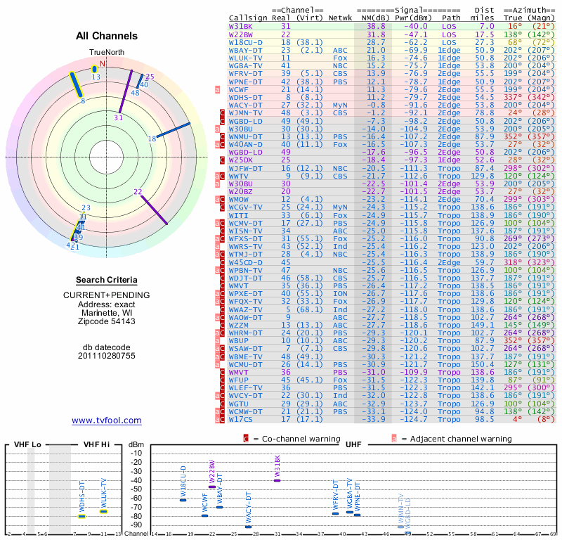 Here are the results for your location. The transmitter database was last updated on June 7, 2013. For more information about these plots and how to interpret them, please check out the Signal Analysis FAQ.