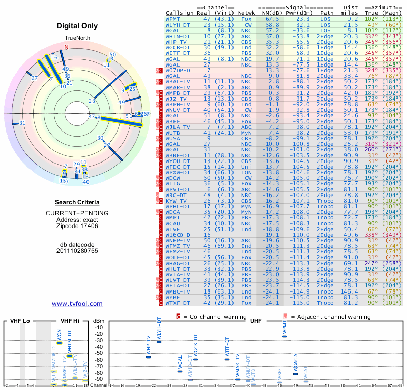 Here are the results for your location. The transmitter database was last updated on June 7, 2013. For more information about these plots and how to interpret them, please check out the Signal Analysis FAQ.
