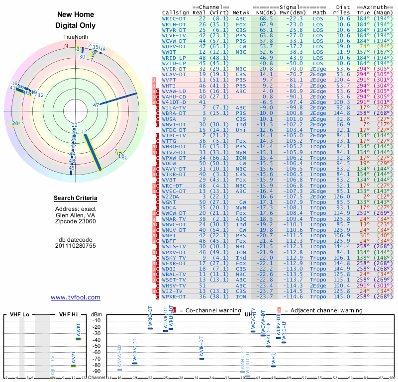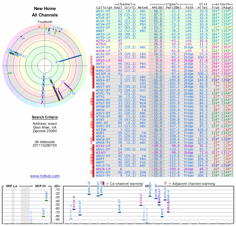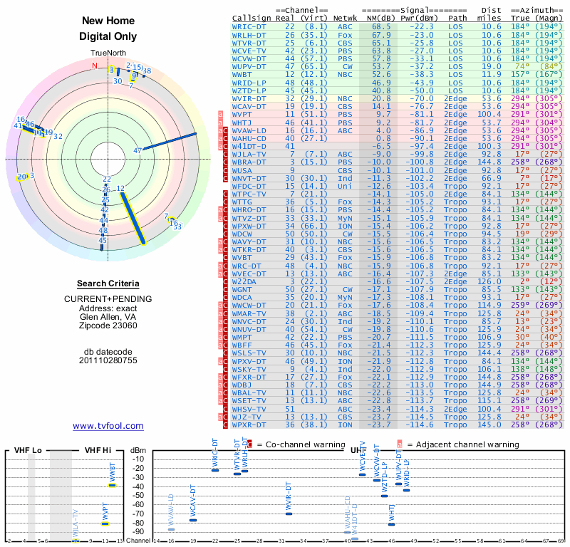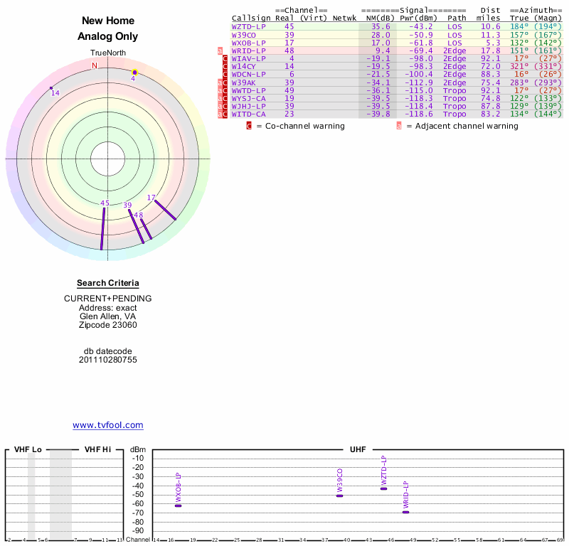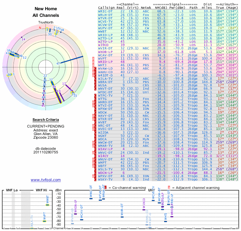Here are the results for your location. The transmitter database was last updated on June 7, 2013. For more information about these plots and how to interpret them, please check out the Signal Analysis FAQ.