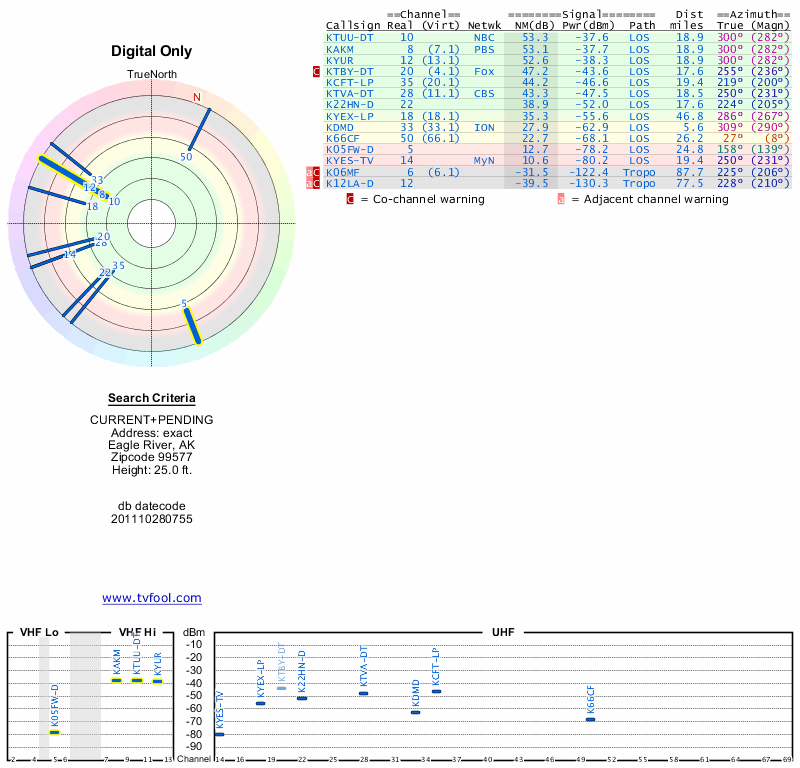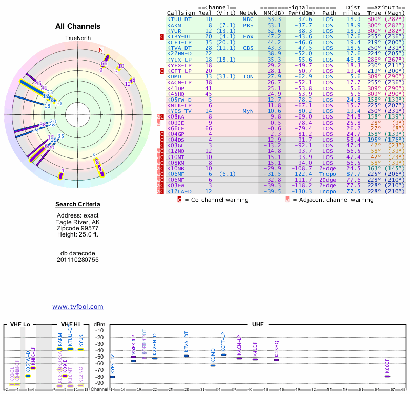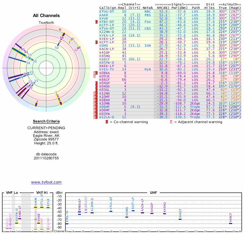 Here are the results for your location. The transmitter database was last updated on June 7, 2013. For more information about these plots and how to interpret them, please check out the Signal Analysis FAQ.