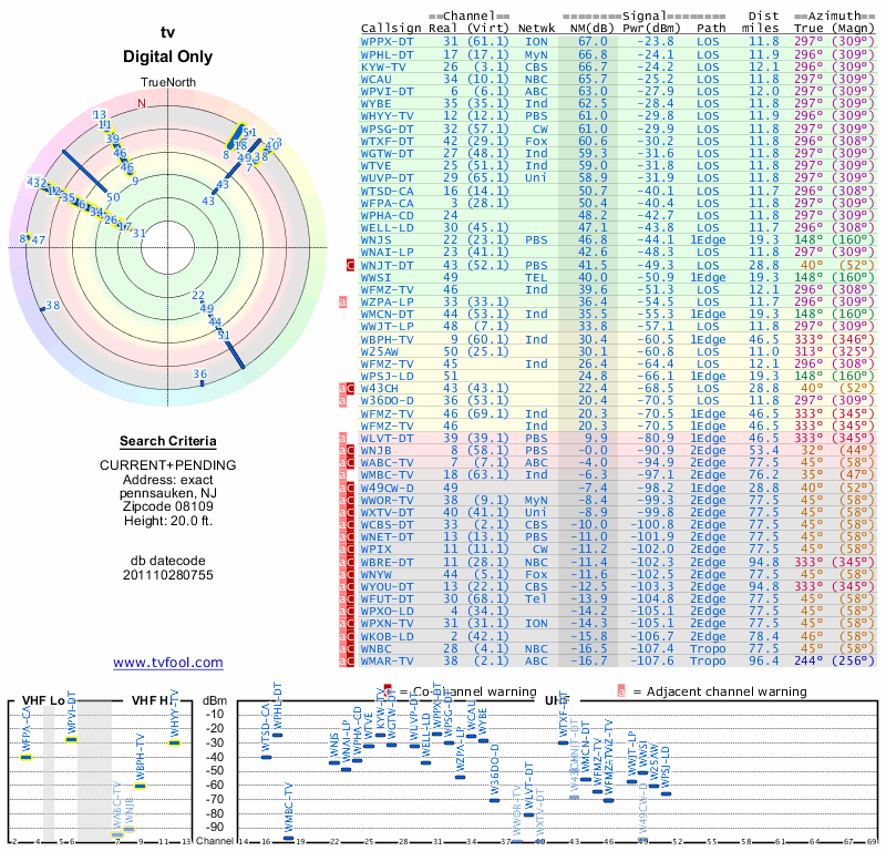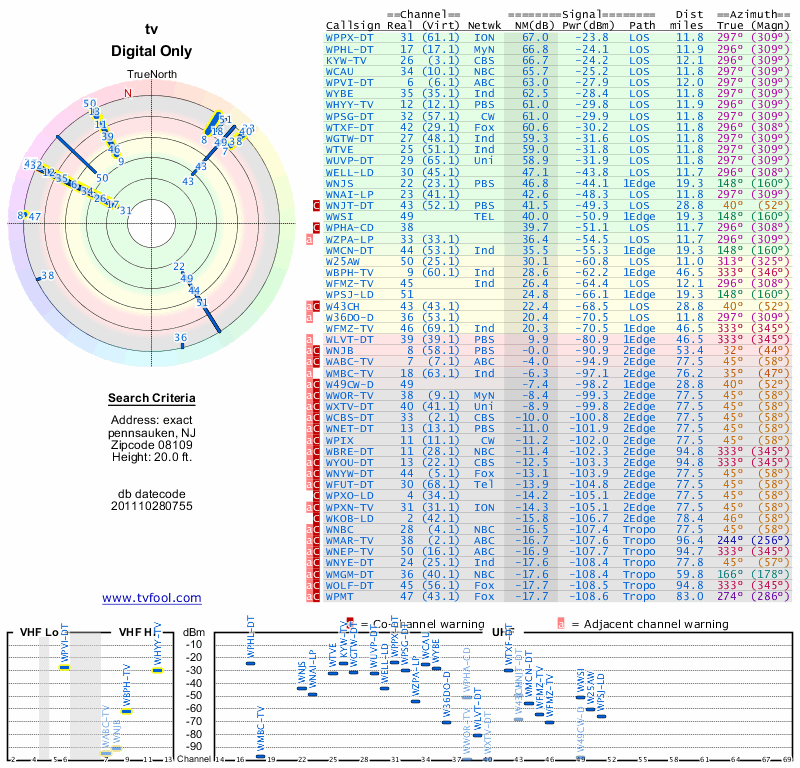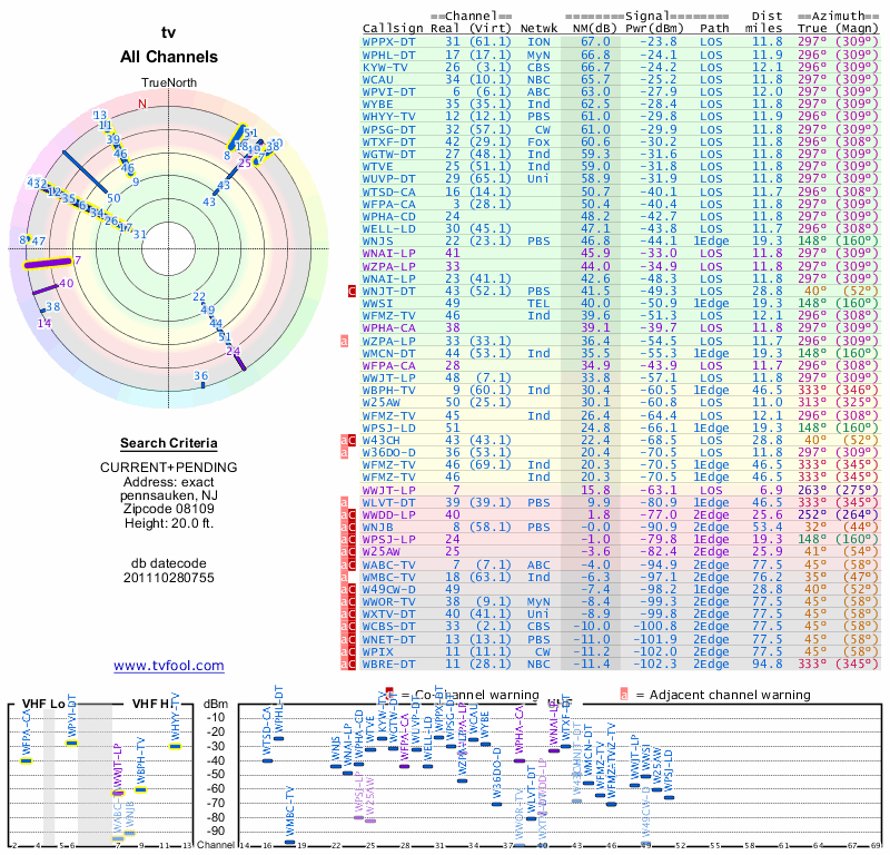 Here are the results for your location. The transmitter database was last updated on June 7, 2013. For more information about these plots and how to interpret them, please check out the Signal Analysis FAQ.
