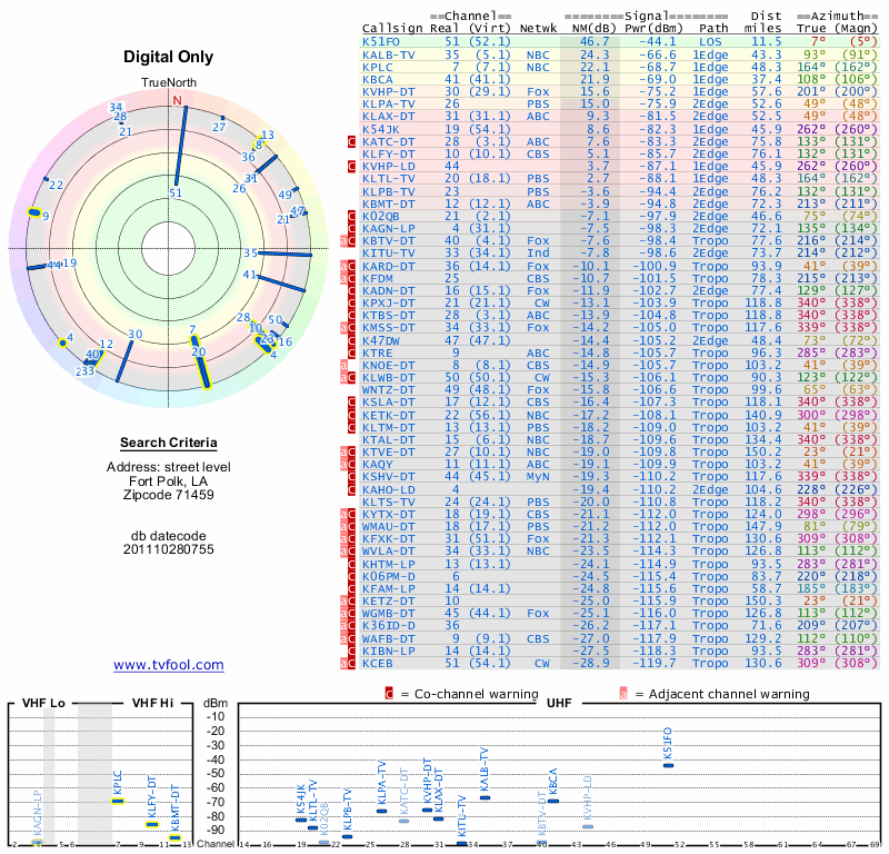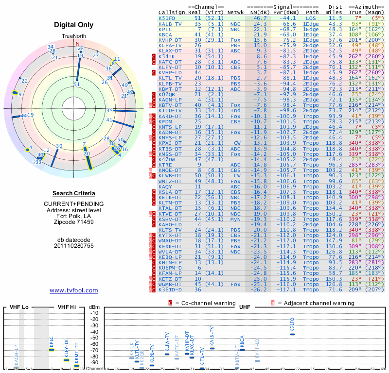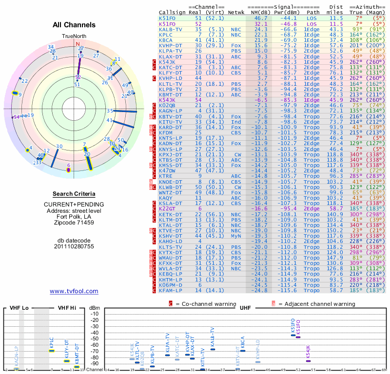 Here are the results for your location. The transmitter database was last updated on June 7, 2013. For more information about these plots and how to interpret them, please check out the Signal Analysis FAQ.