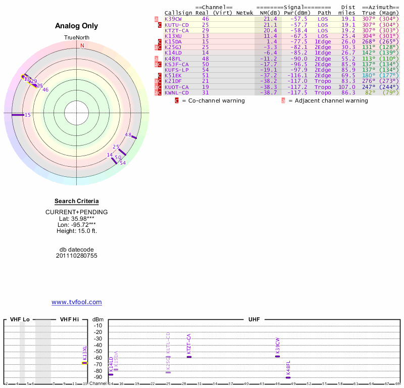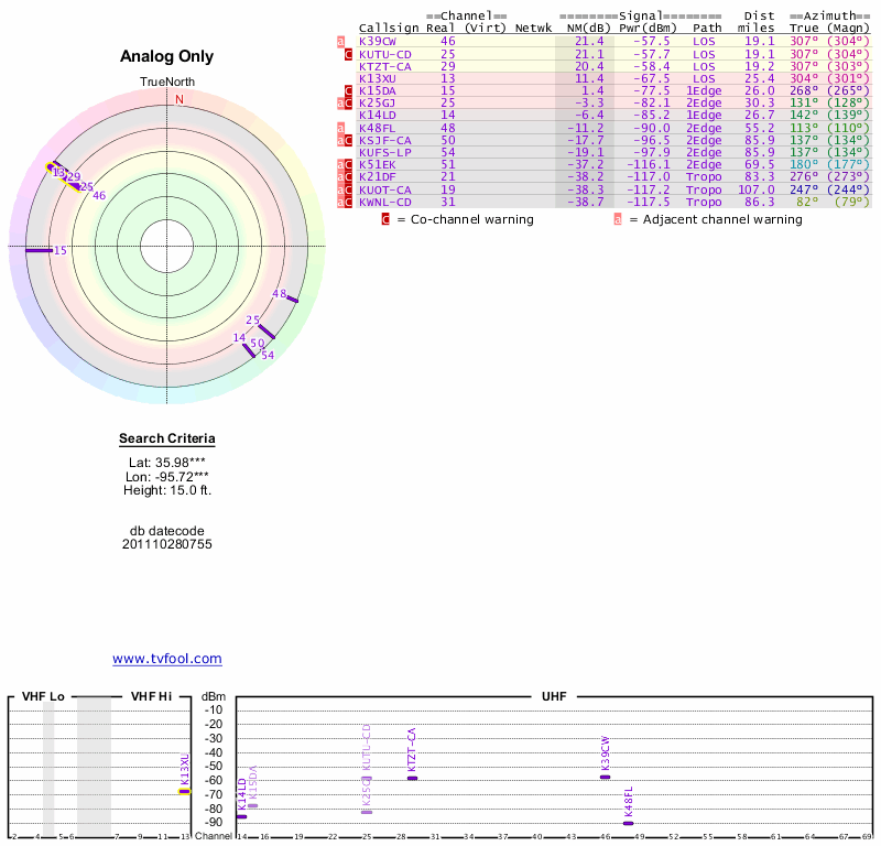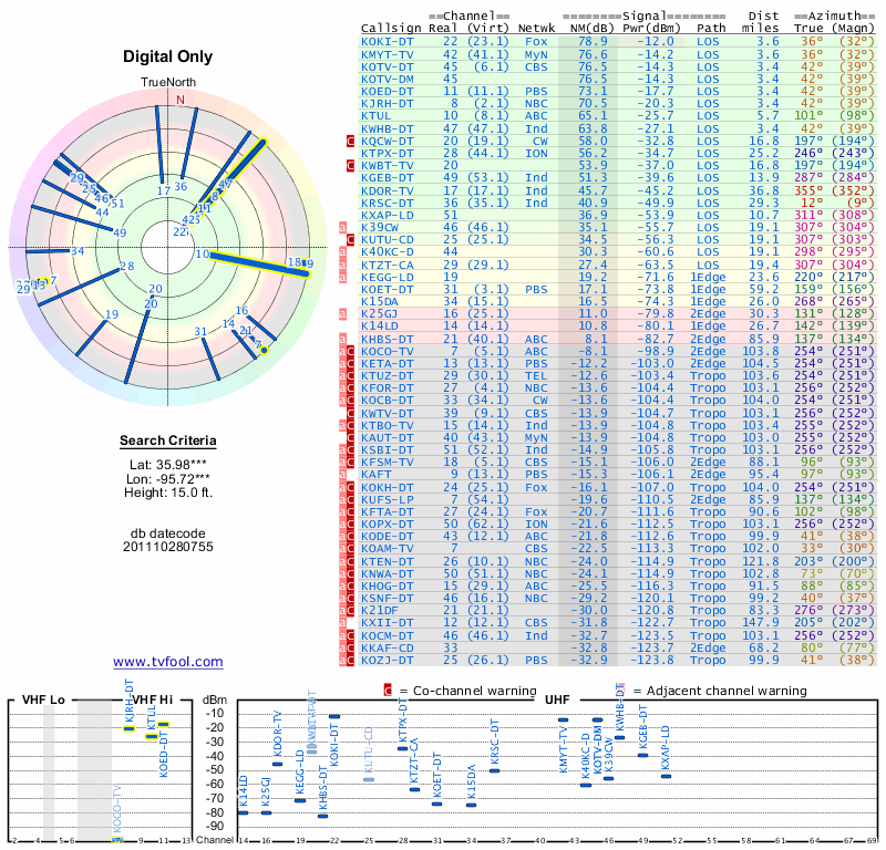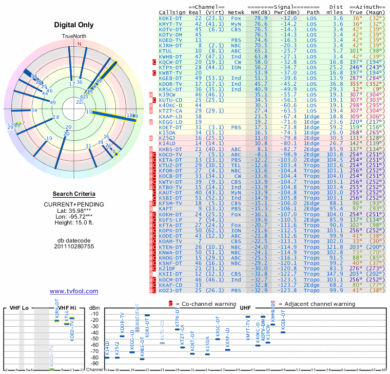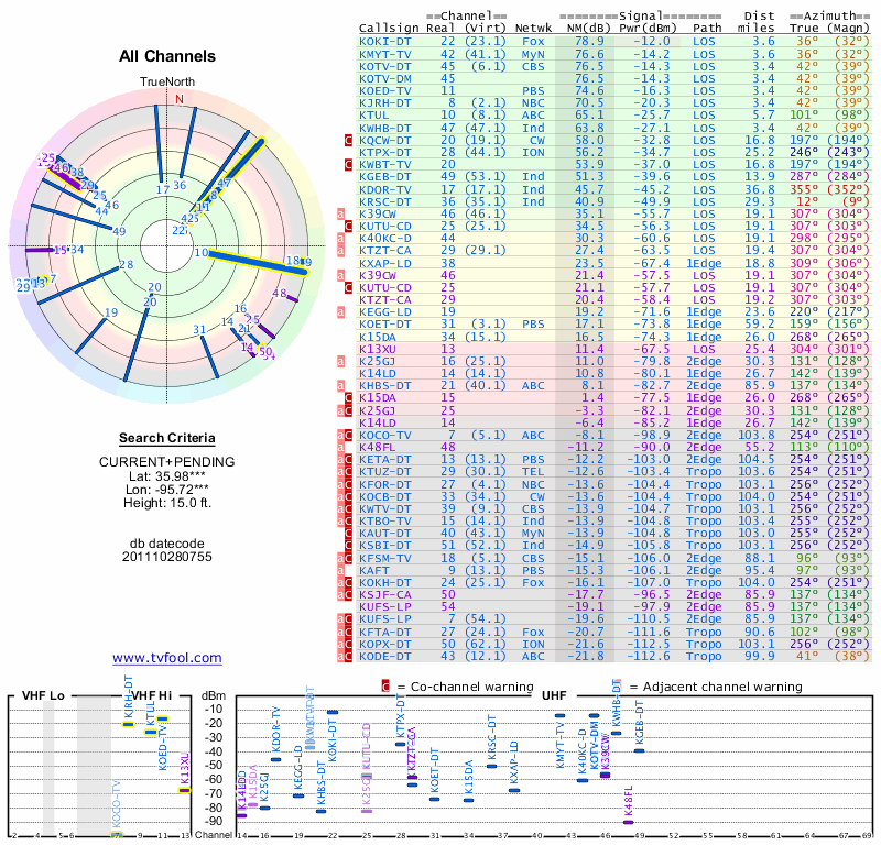 Here are the results for your location. The transmitter database was last updated on June 7, 2013. For more information about these plots and how to interpret them, please check out the Signal Analysis FAQ.