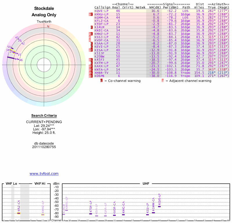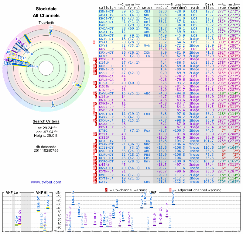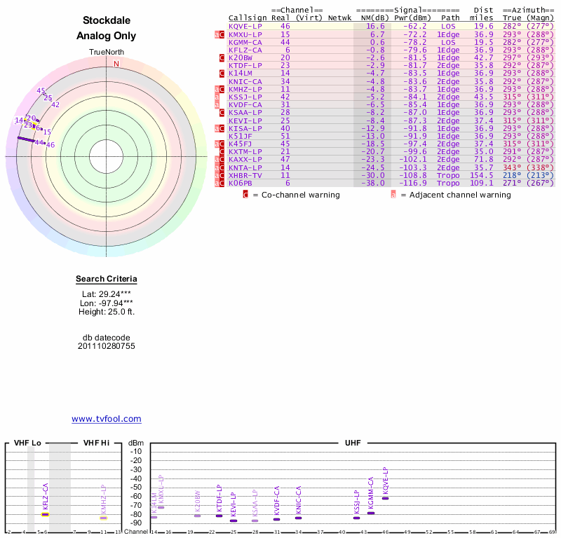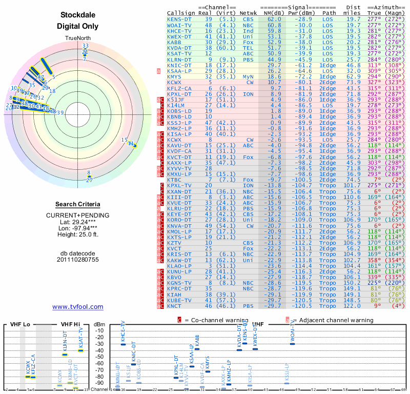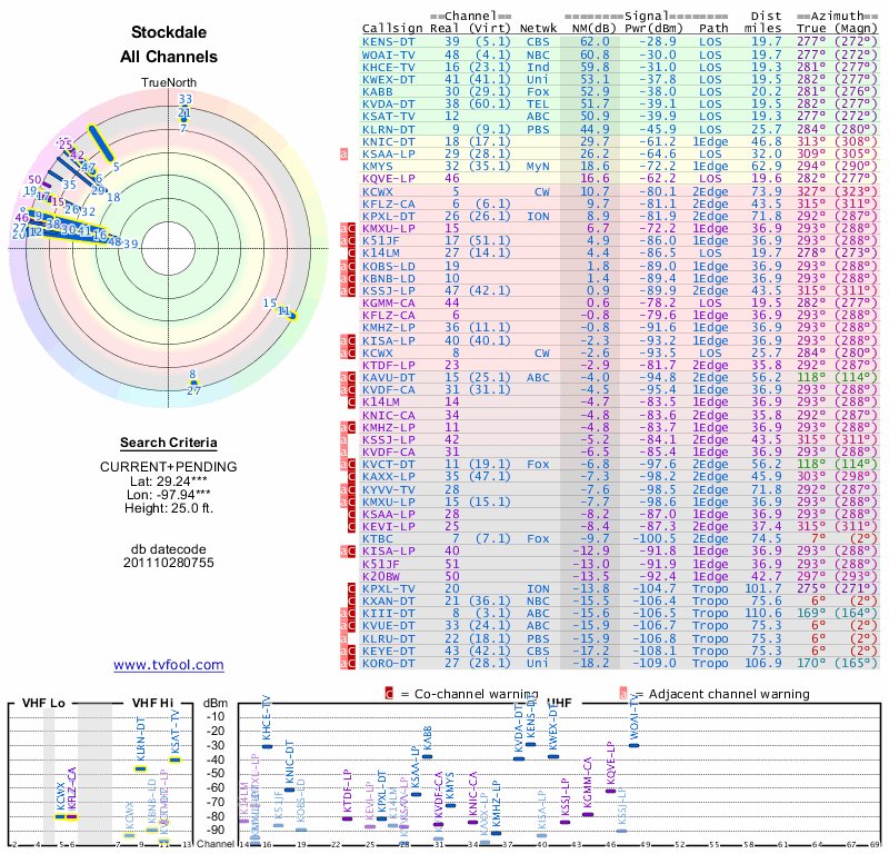 Here are the results for your location. The transmitter database was last updated on June 7, 2013. For more information about these plots and how to interpret them, please check out the Signal Analysis FAQ.