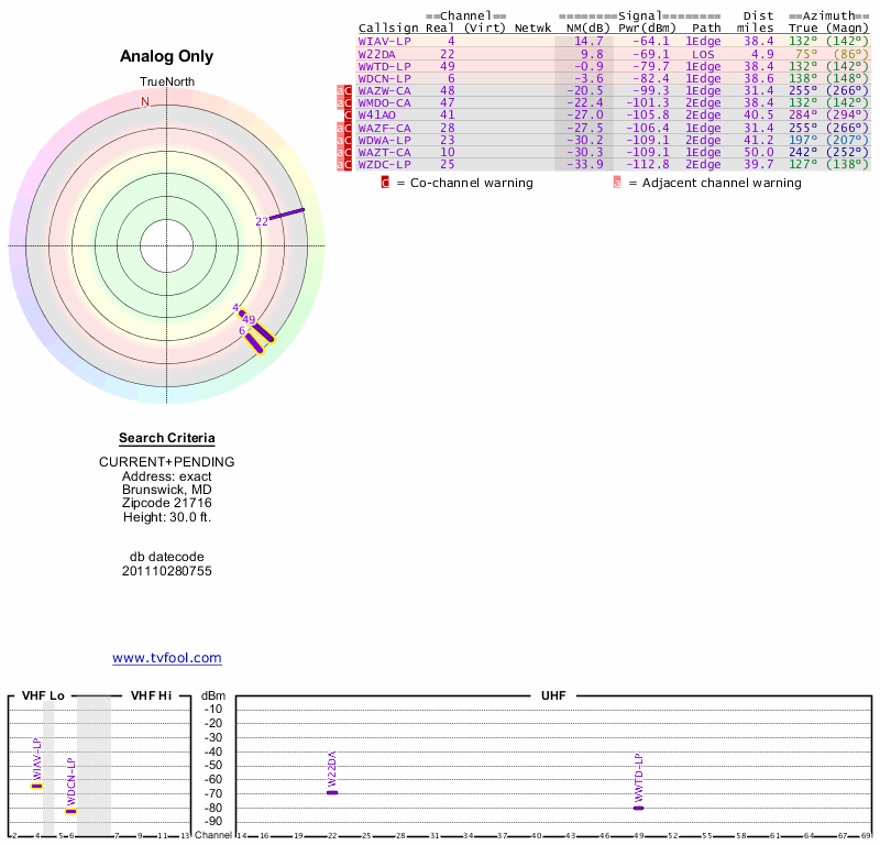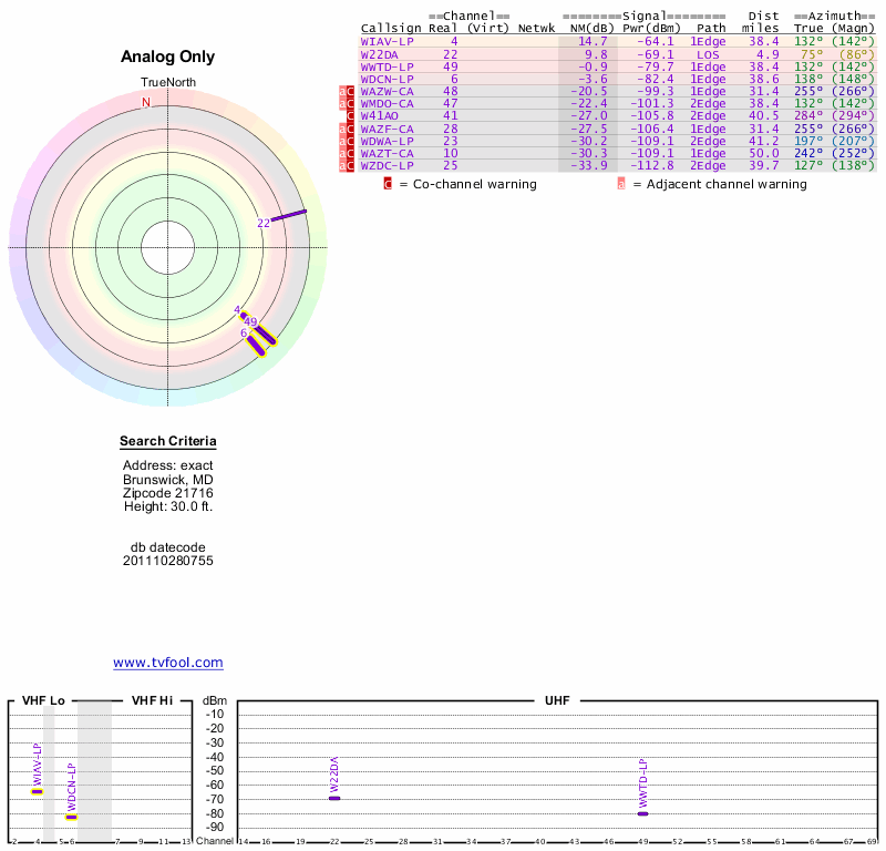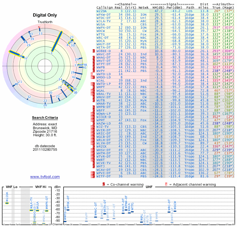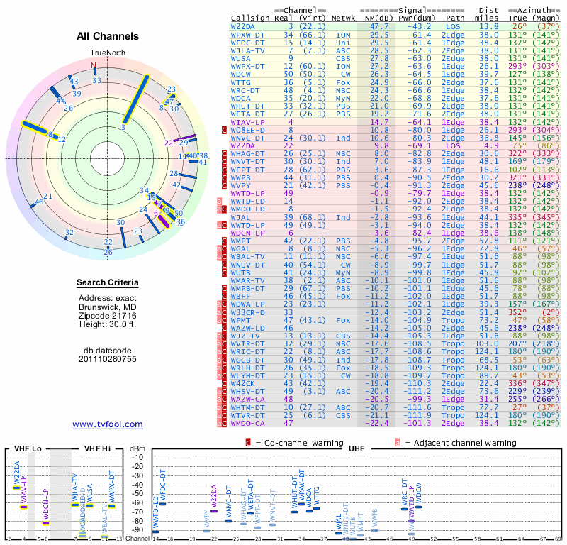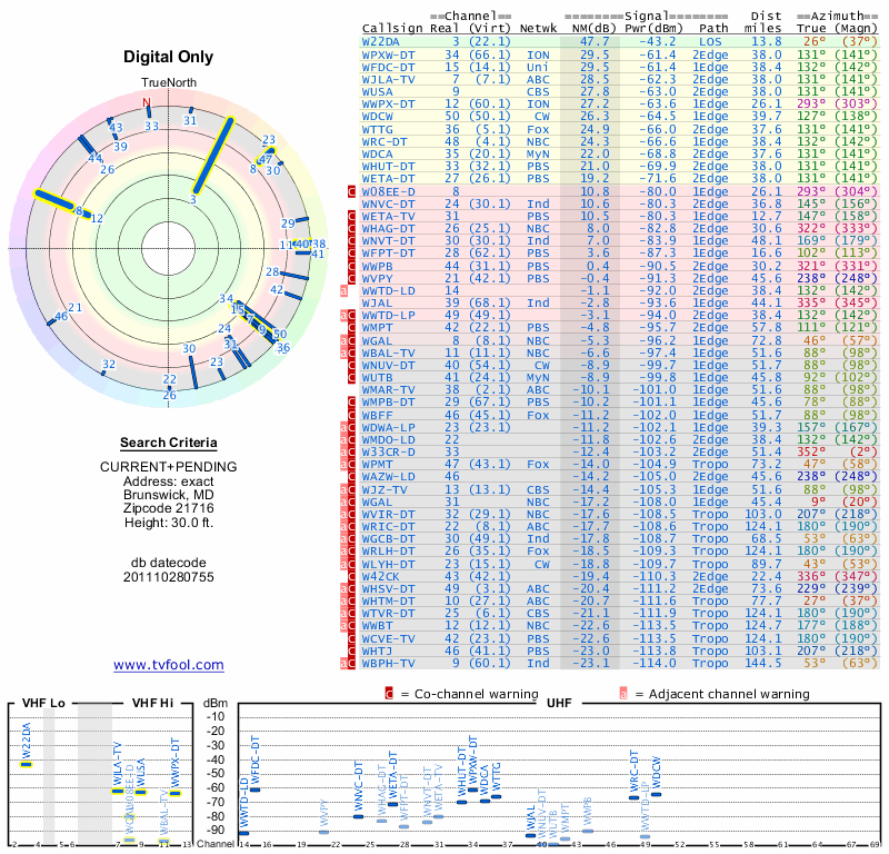 Here are the results for your location. The transmitter database was last updated on June 7, 2013. For more information about these plots and how to interpret them, please check out the Signal Analysis FAQ.