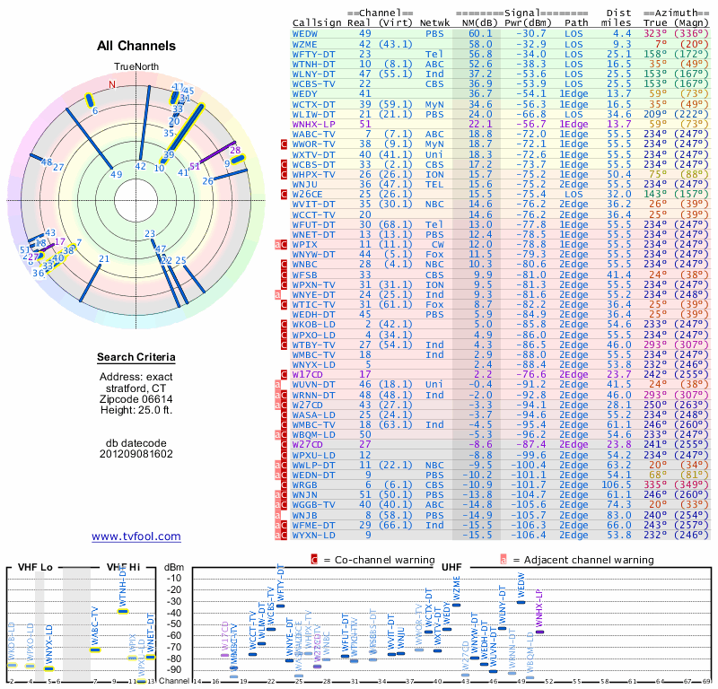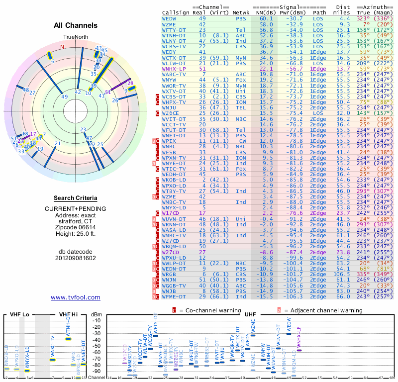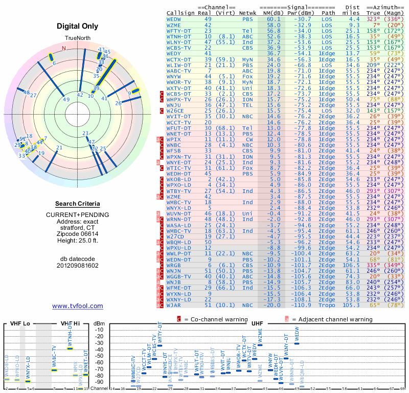 Here are the results for your location. The transmitter database was last updated on June 7, 2013. For more information about these plots and how to interpret them, please check out the Signal Analysis FAQ.