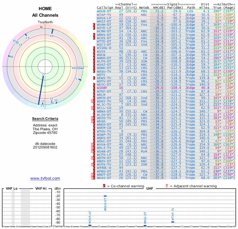 Here are the results for your location. The transmitter database was last updated on June 7, 2013. For more information about these plots and how to interpret them, please check out the Signal Analysis FAQ.