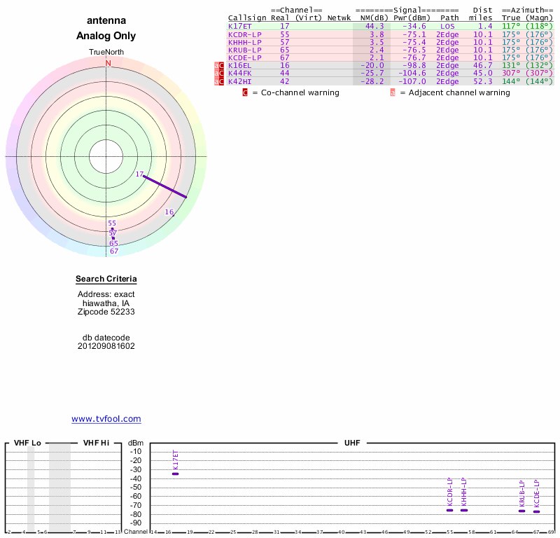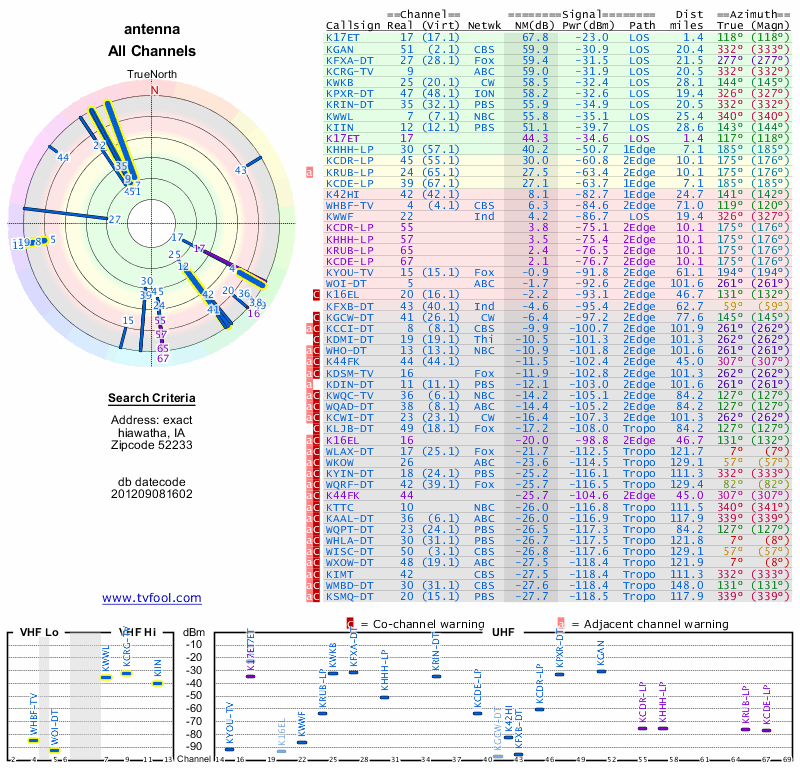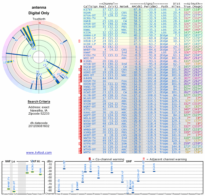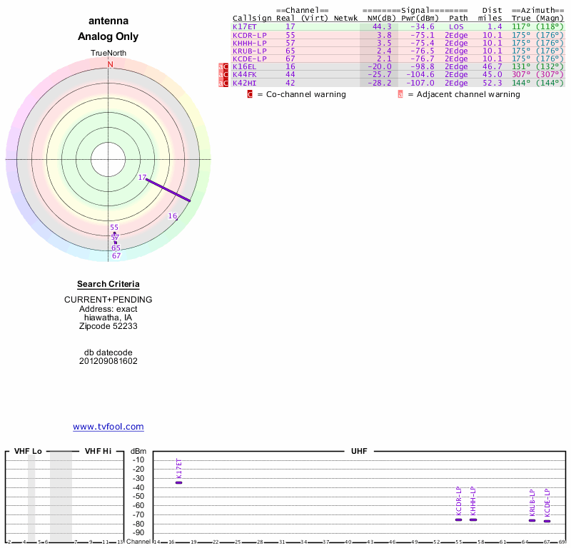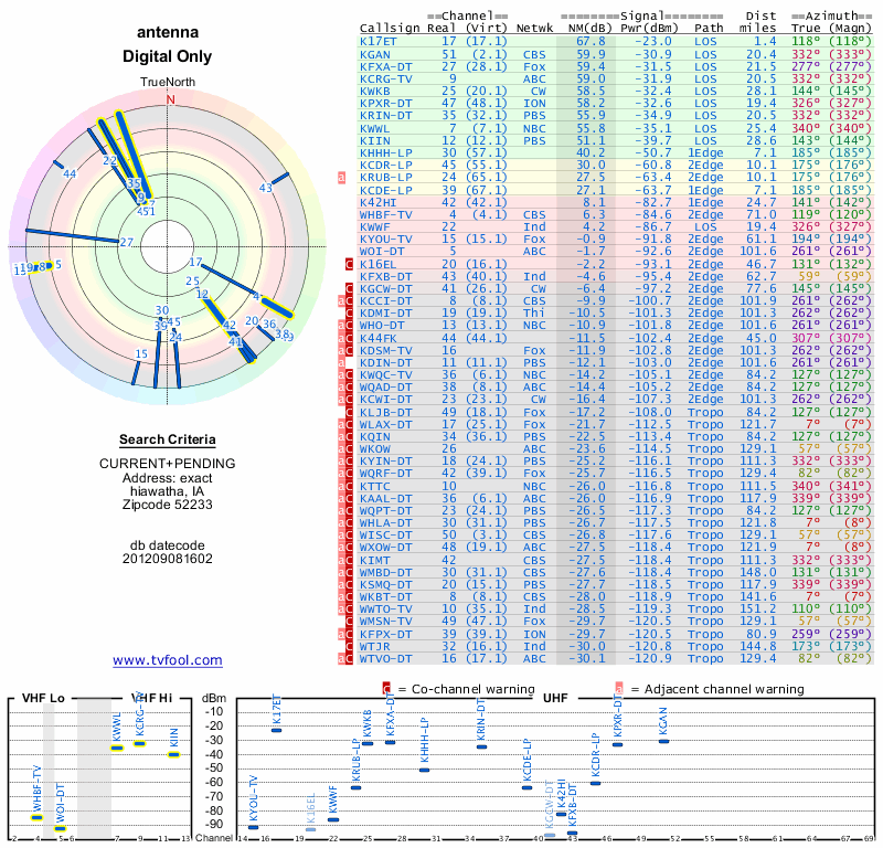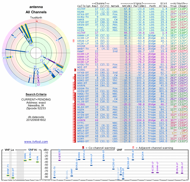 Here are the results for your location. The transmitter database was last updated on June 7, 2013. For more information about these plots and how to interpret them, please check out the Signal Analysis FAQ.
