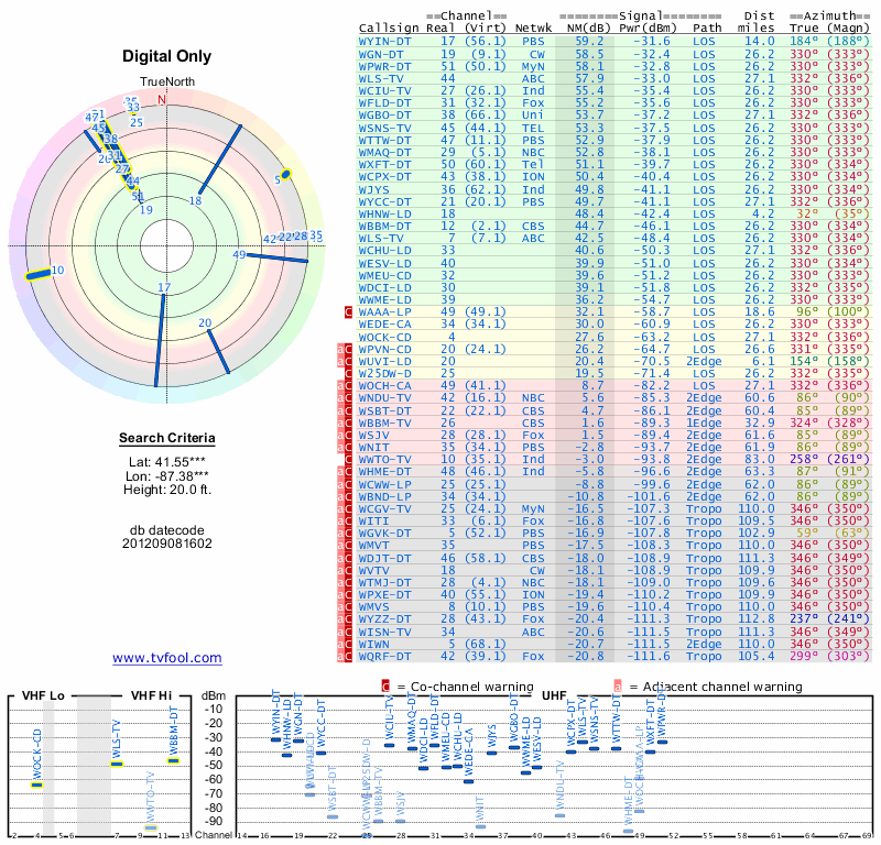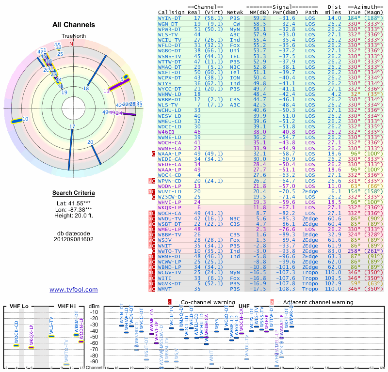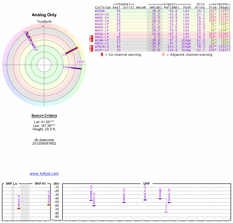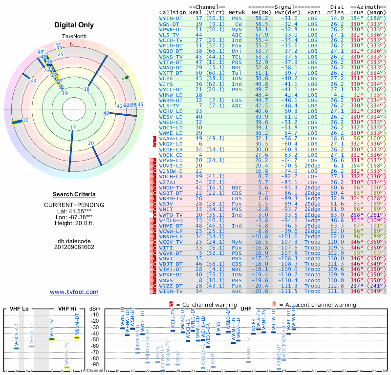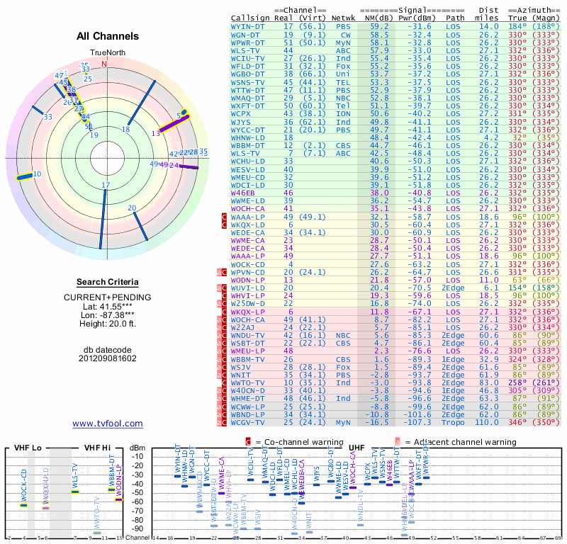 Here are the results for your location. The transmitter database was last updated on June 7, 2013. For more information about these plots and how to interpret them, please check out the Signal Analysis FAQ.