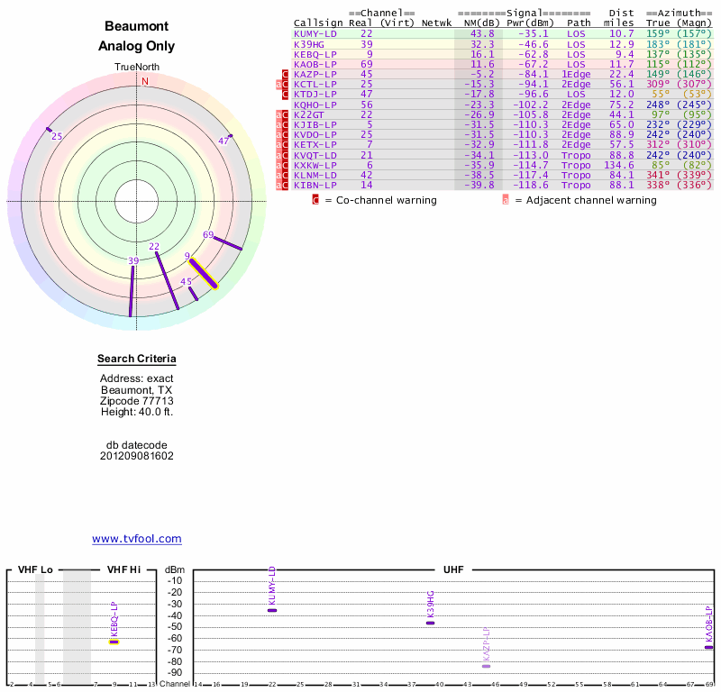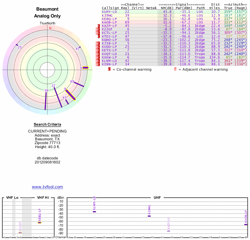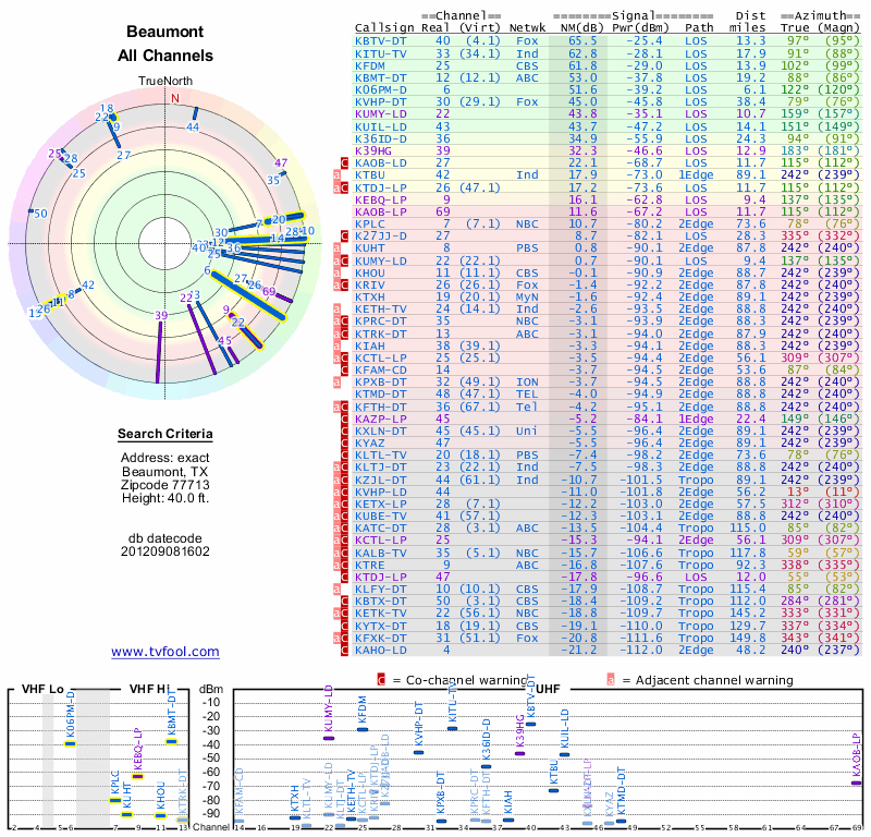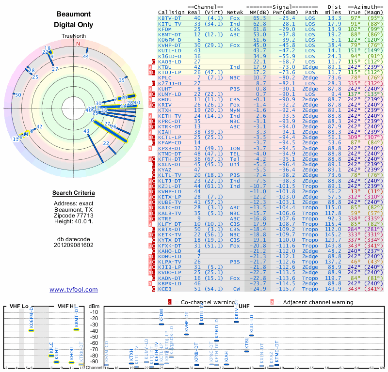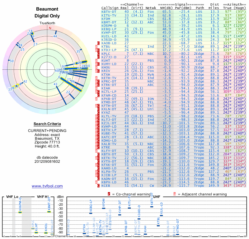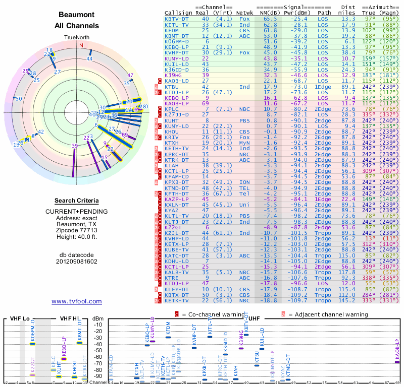 Here are the results for your location. The transmitter database was last updated on June 7, 2013. For more information about these plots and how to interpret them, please check out the Signal Analysis FAQ.