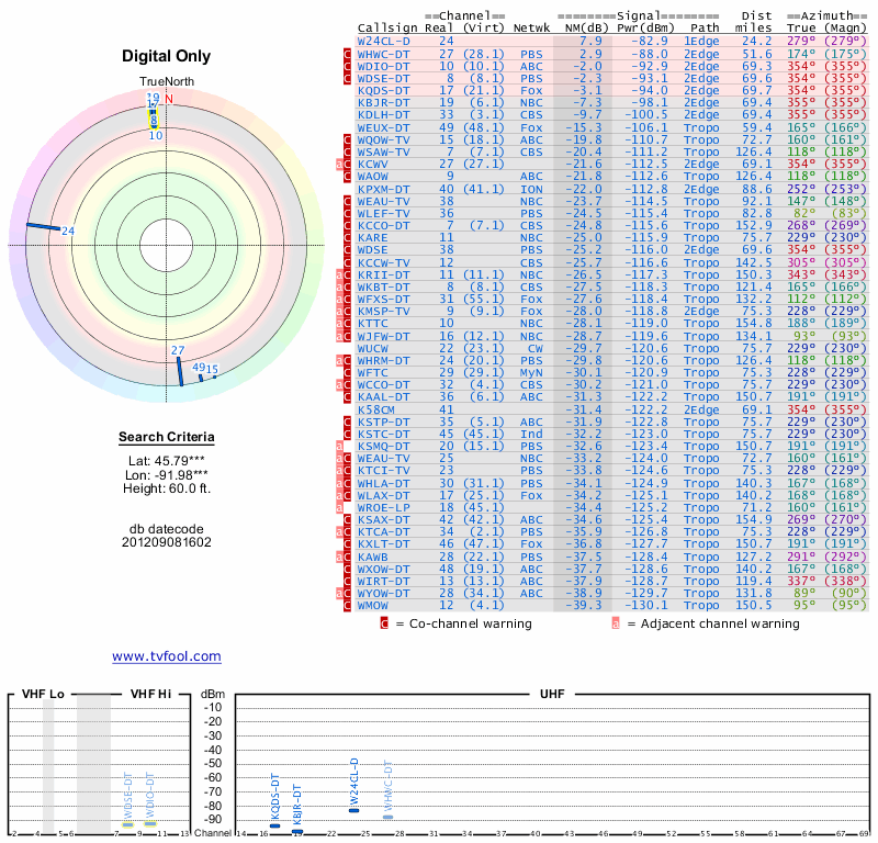 Here are the results for your location. The transmitter database was last updated on June 7, 2013. For more information about these plots and how to interpret them, please check out the Signal Analysis FAQ.