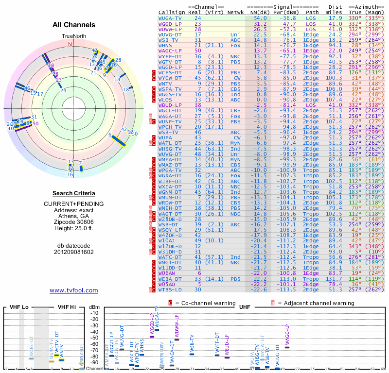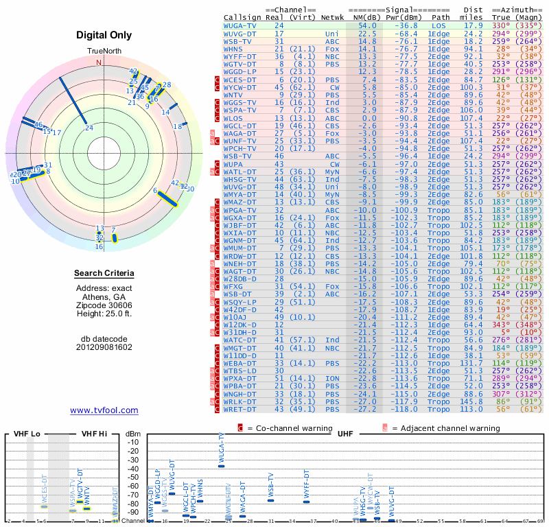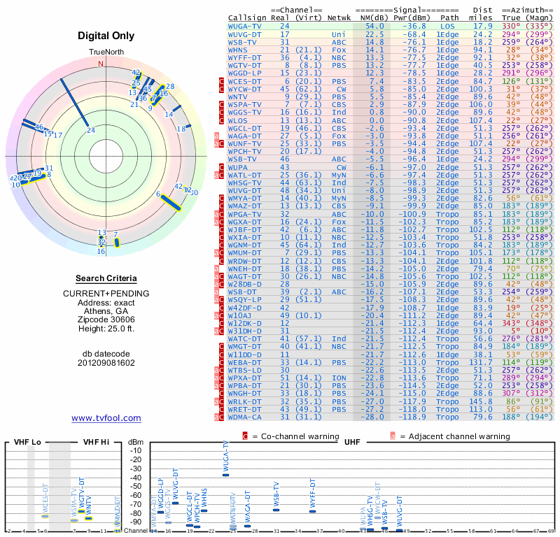 Here are the results for your location. The transmitter database was last updated on June 7, 2013. For more information about these plots and how to interpret them, please check out the Signal Analysis FAQ.