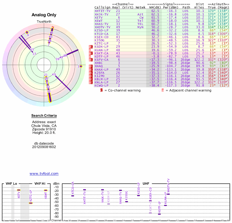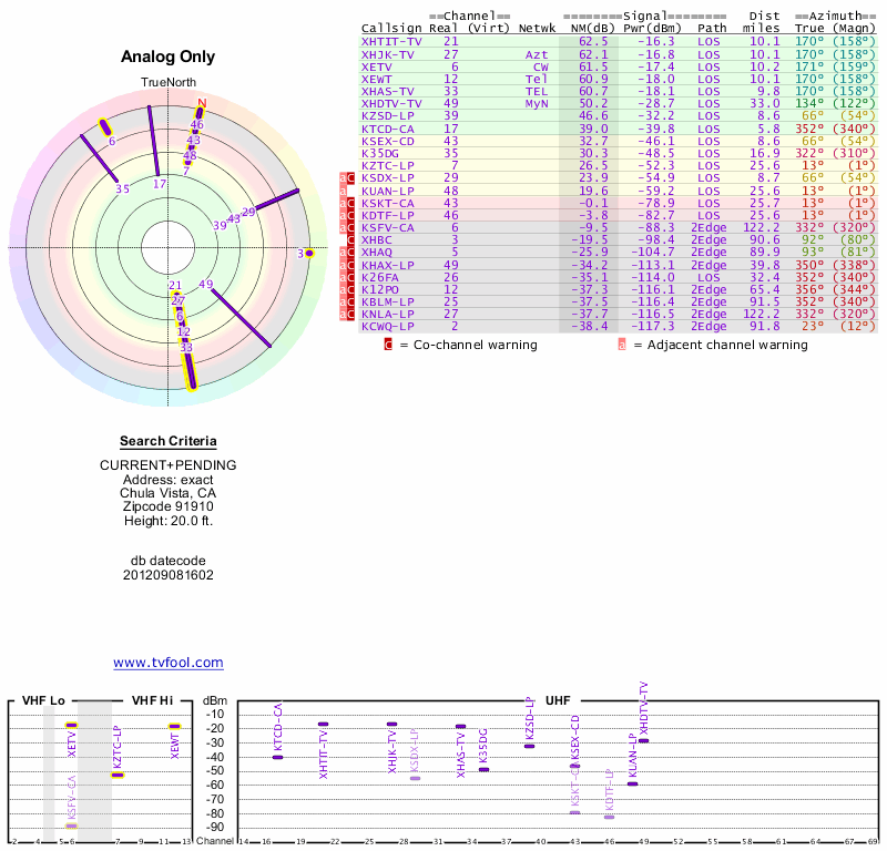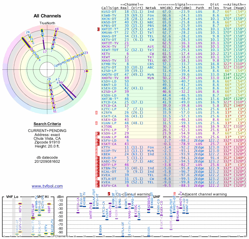Here are the results for your location. The transmitter database was last updated on June 7, 2013. For more information about these plots and how to interpret them, please check out the Signal Analysis FAQ.