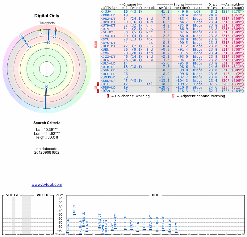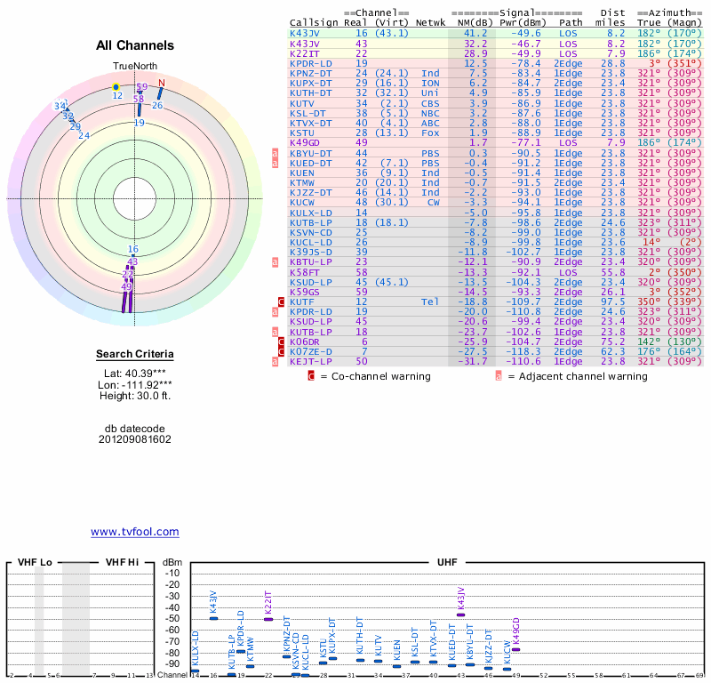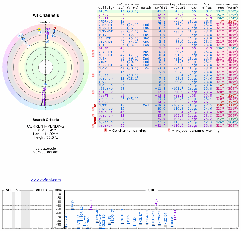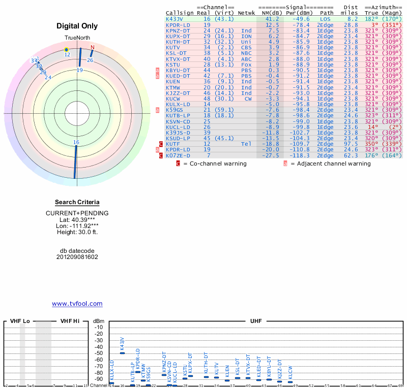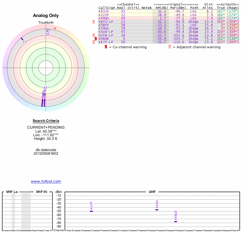 Here are the results for your location. The transmitter database was last updated on June 7, 2013. For more information about these plots and how to interpret them, please check out the Signal Analysis FAQ.