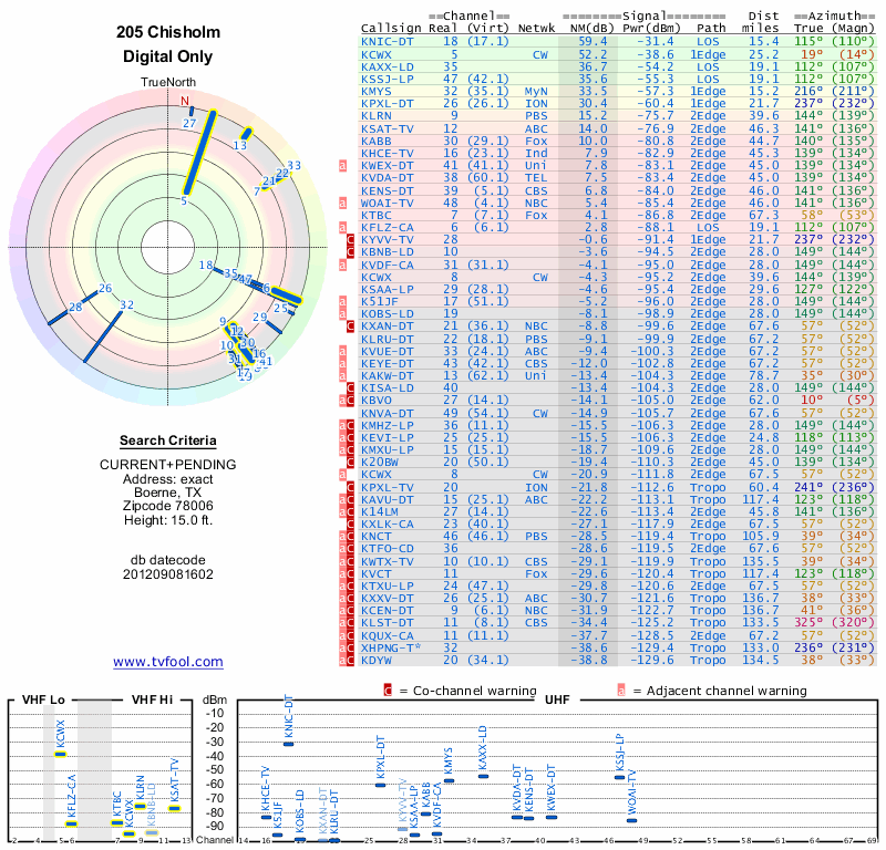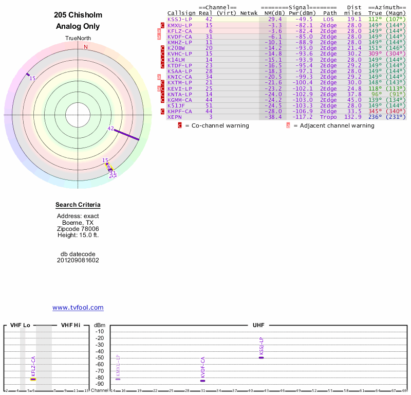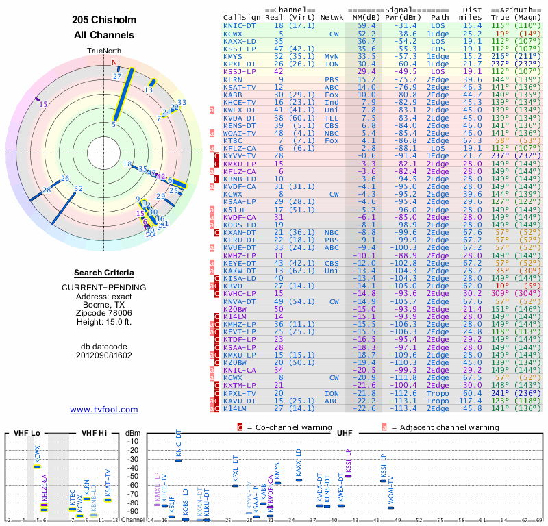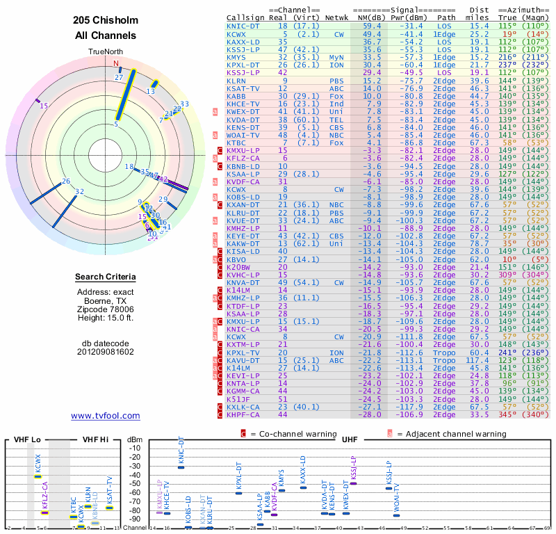 Here are the results for your location. The transmitter database was last updated on June 7, 2013. For more information about these plots and how to interpret them, please check out the Signal Analysis FAQ.