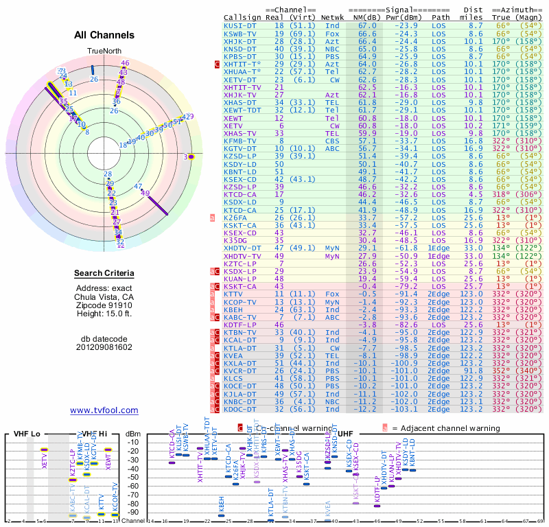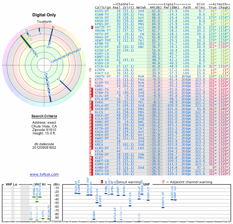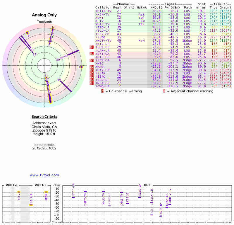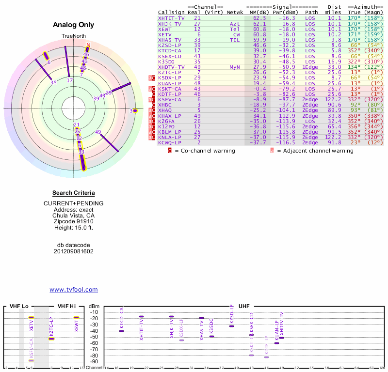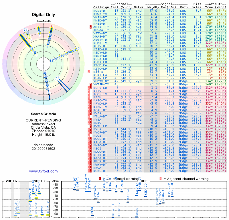Here are the results for your location. The transmitter database was last updated on June 7, 2013. For more information about these plots and how to interpret them, please check out the Signal Analysis FAQ.