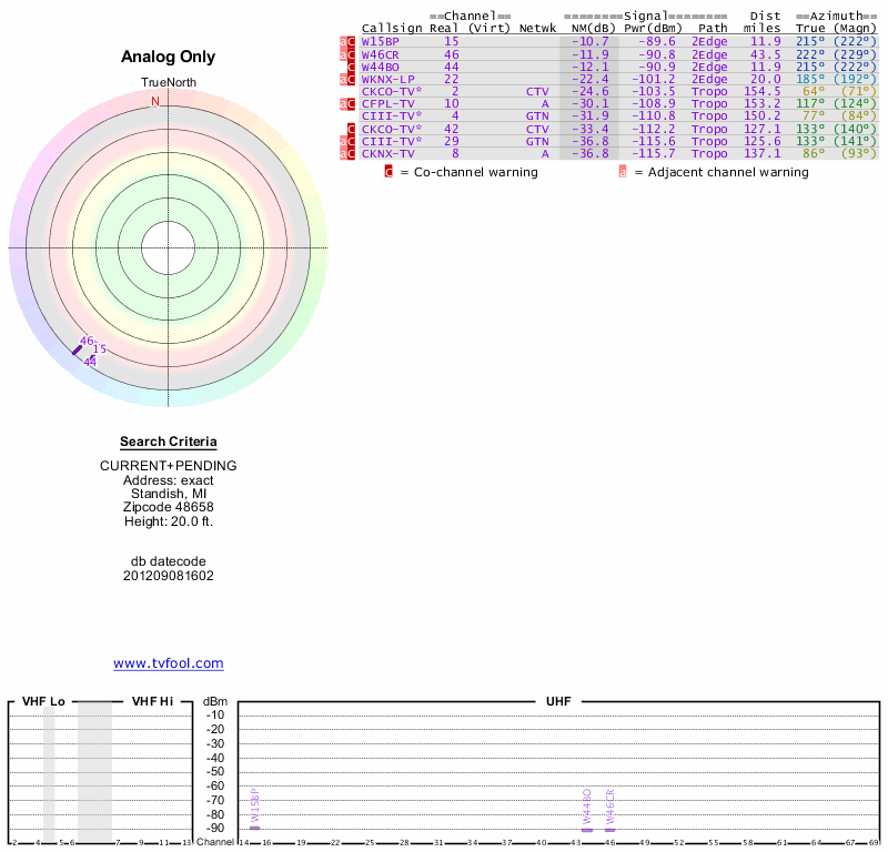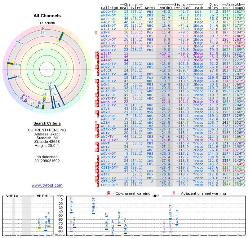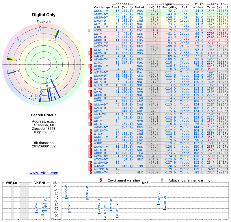 Here are the results for your location. The transmitter database was last updated on June 7, 2013. For more information about these plots and how to interpret them, please check out the Signal Analysis FAQ.