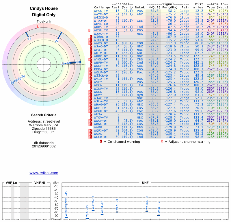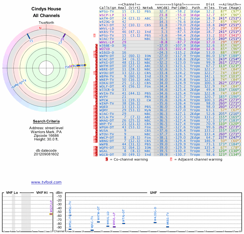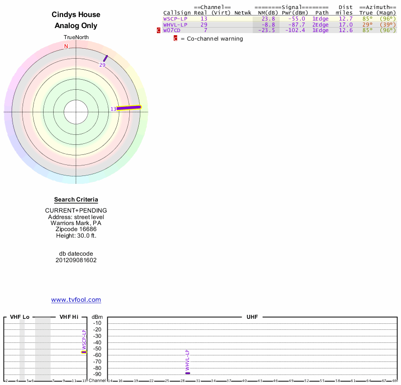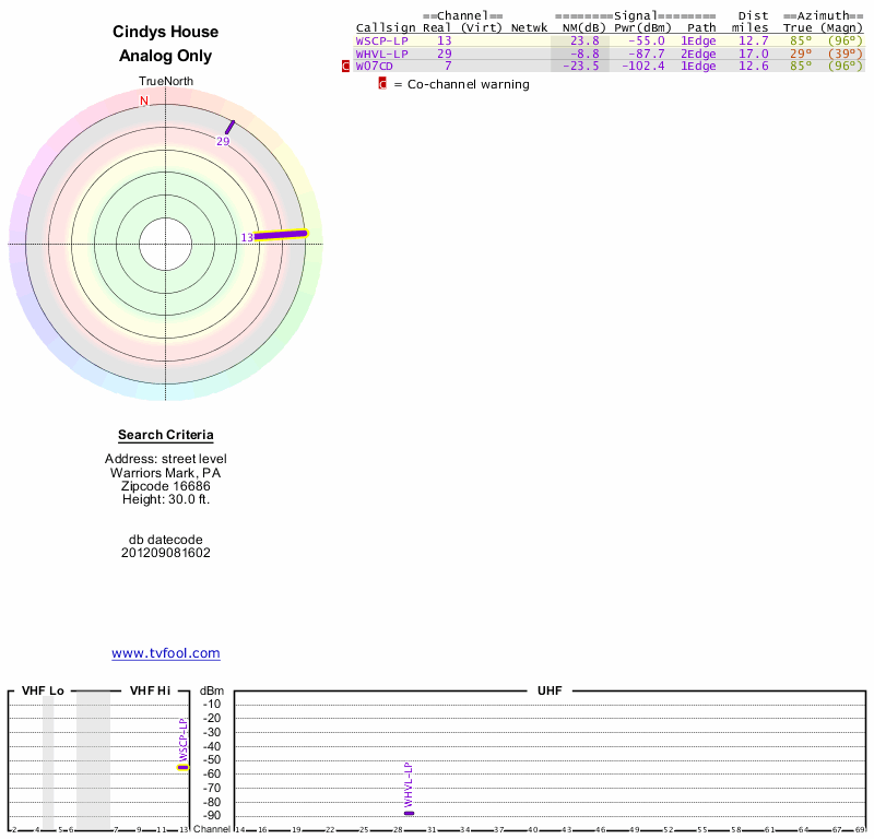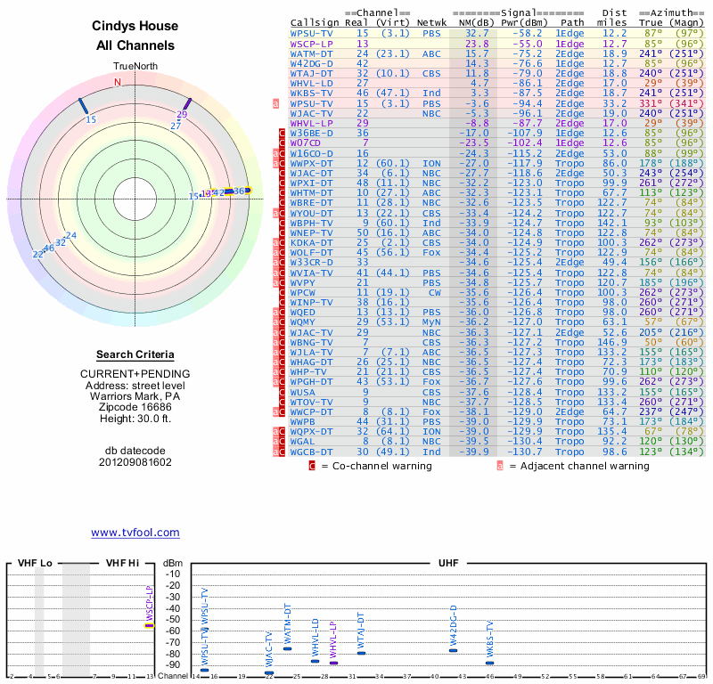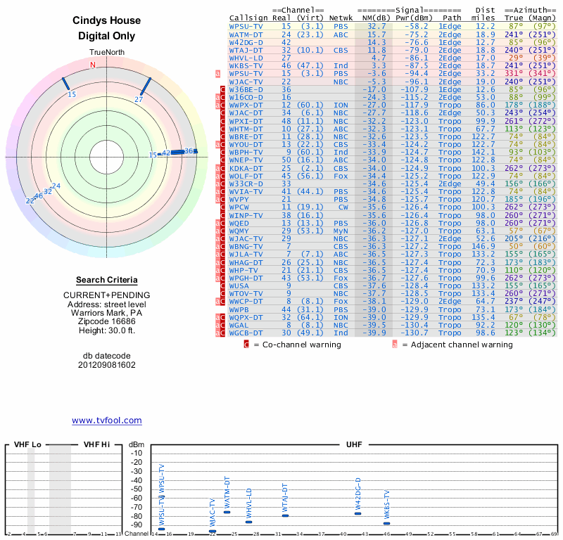 Here are the results for your location. The transmitter database was last updated on June 7, 2013. For more information about these plots and how to interpret them, please check out the Signal Analysis FAQ.