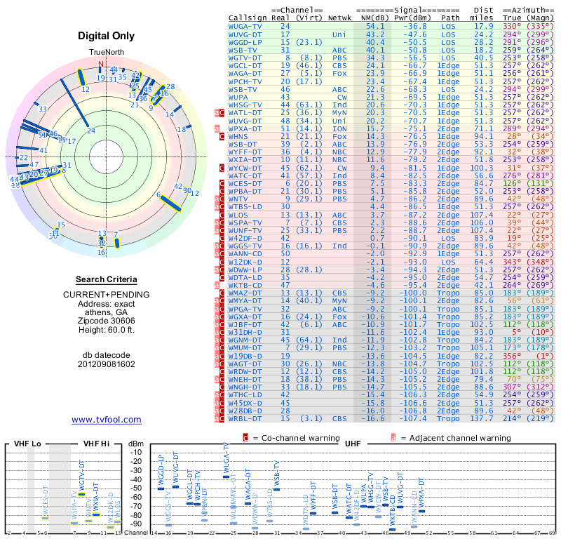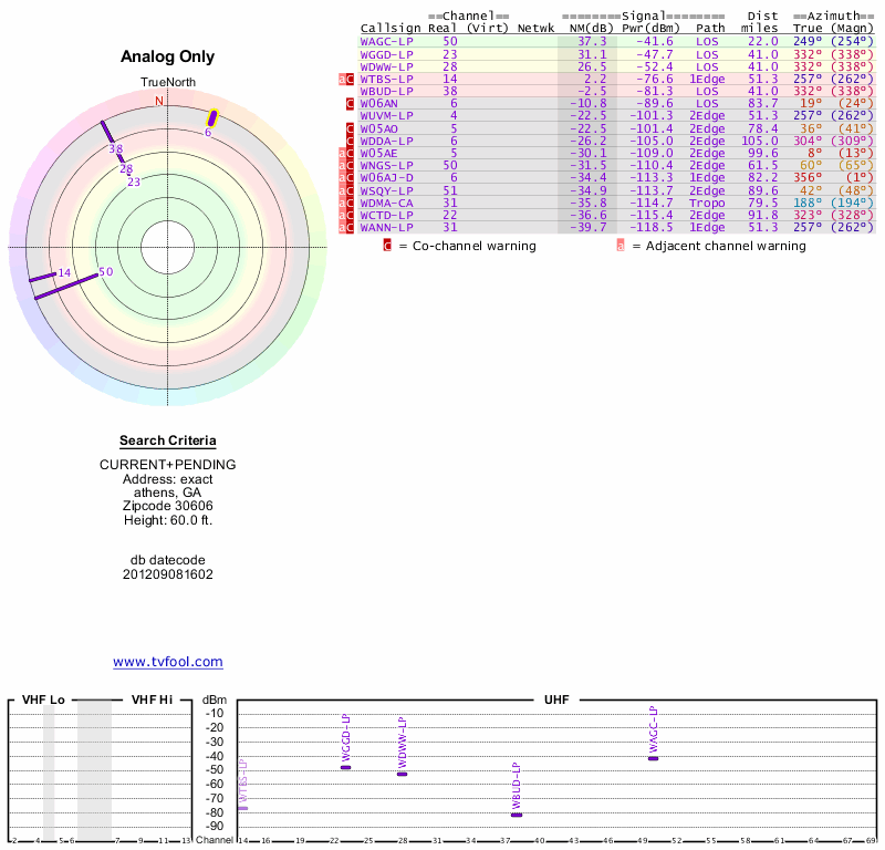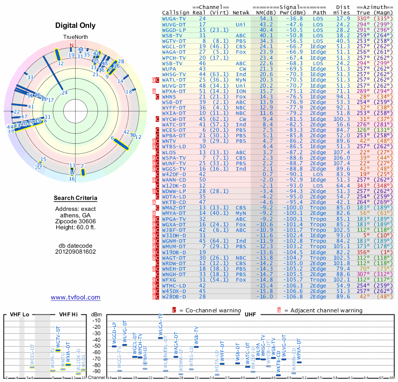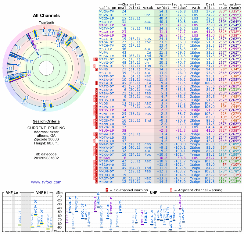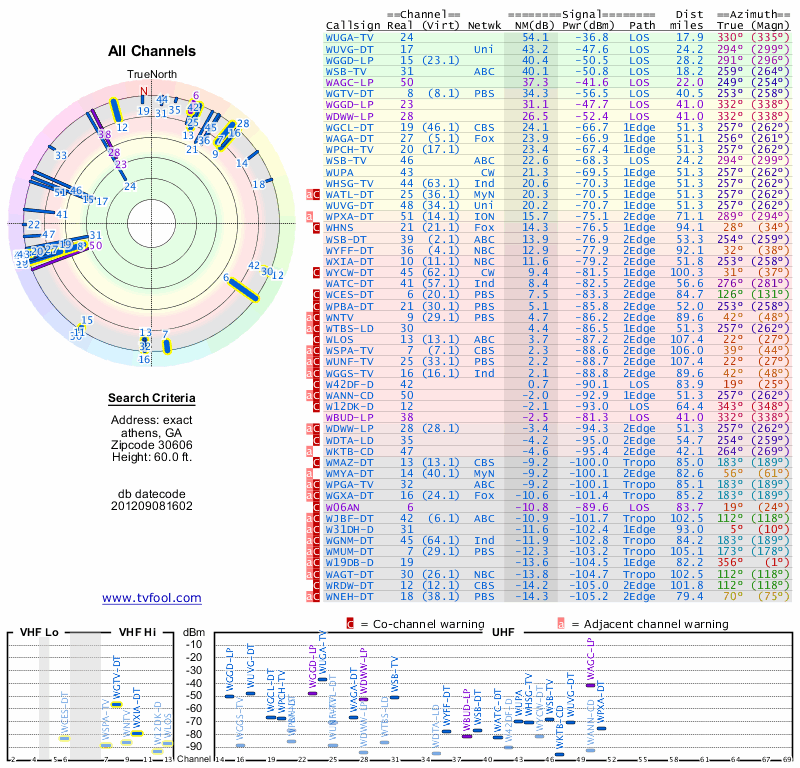 Here are the results for your location. The transmitter database was last updated on June 7, 2013. For more information about these plots and how to interpret them, please check out the Signal Analysis FAQ.