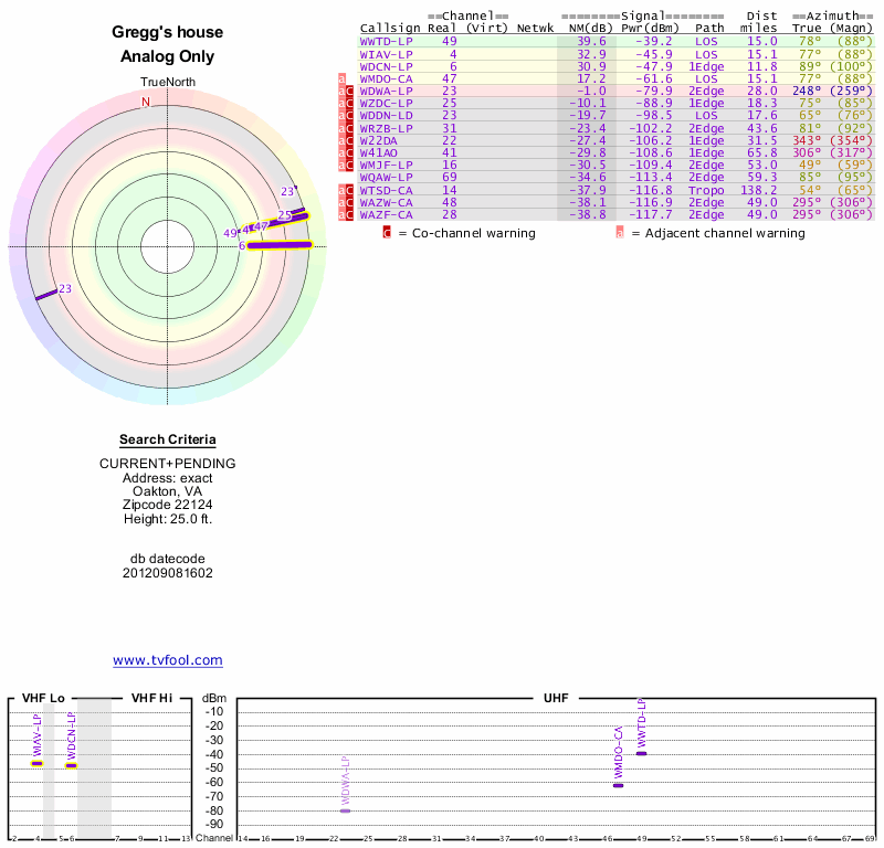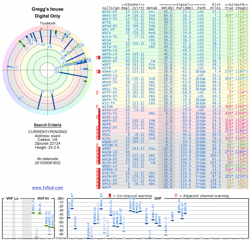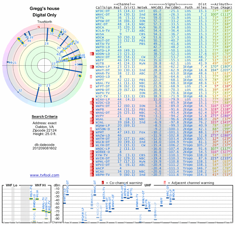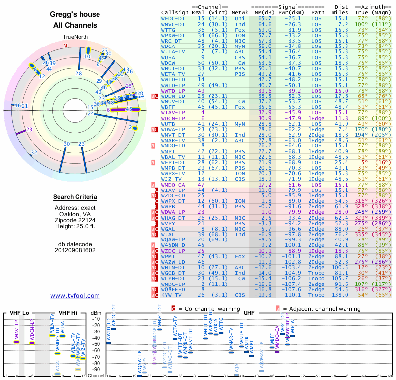 Here are the results for your location. The transmitter database was last updated on June 7, 2013. For more information about these plots and how to interpret them, please check out the Signal Analysis FAQ.