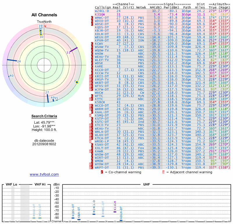 Here are the results for your location. The transmitter database was last updated on June 7, 2013. For more information about these plots and how to interpret them, please check out the Signal Analysis FAQ.
