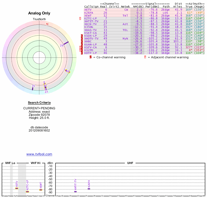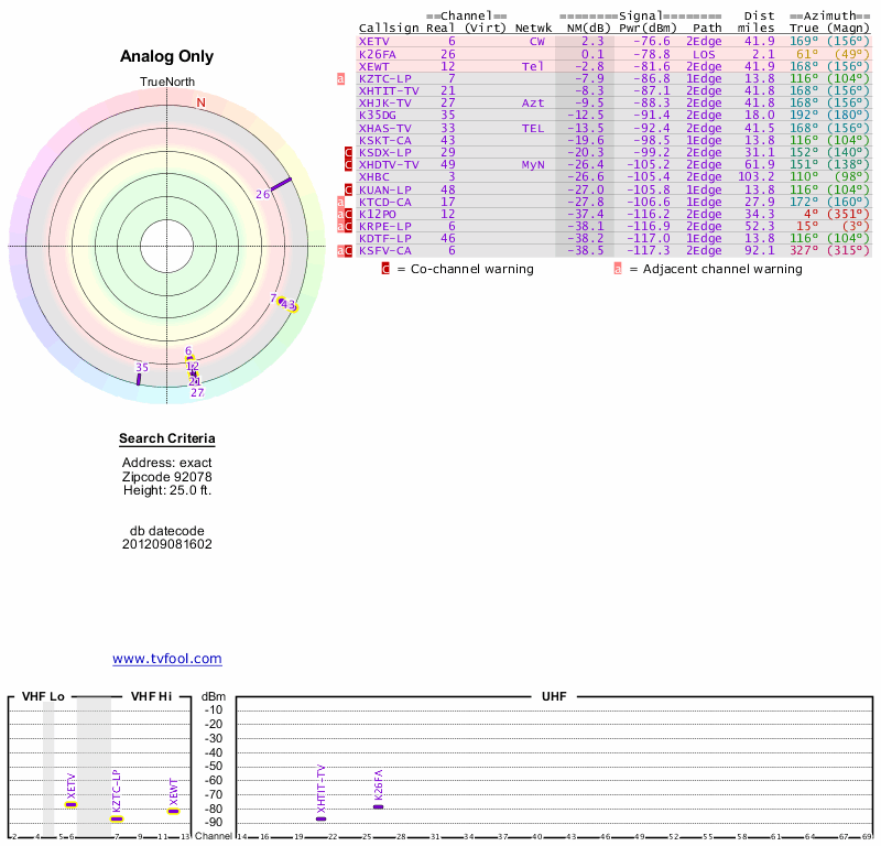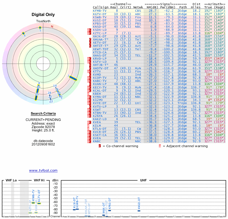 Here are the results for your location. The transmitter database was last updated on June 7, 2013. For more information about these plots and how to interpret them, please check out the Signal Analysis FAQ.