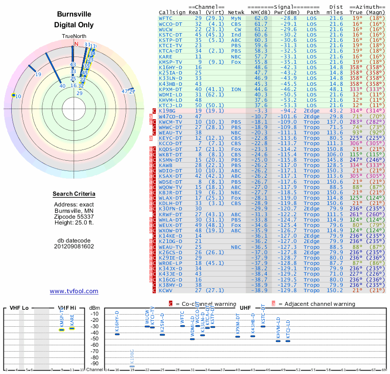 Here are the results for your location. The transmitter database was last updated on June 7, 2013. For more information about these plots and how to interpret them, please check out the Signal Analysis FAQ.