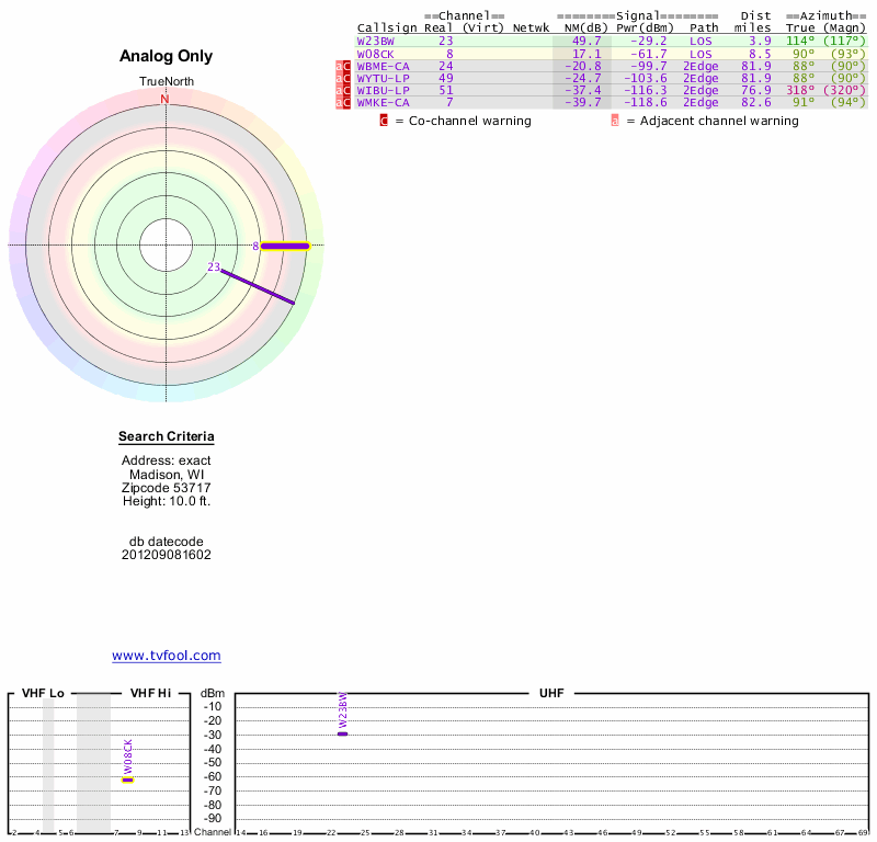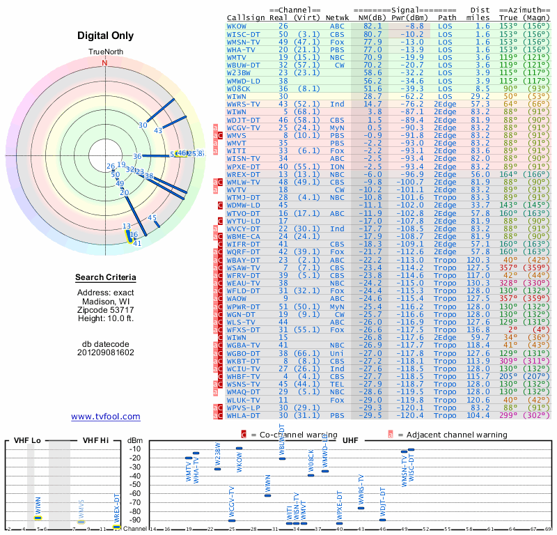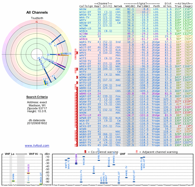 Here are the results for your location. The transmitter database was last updated on June 7, 2013. For more information about these plots and how to interpret them, please check out the Signal Analysis FAQ.