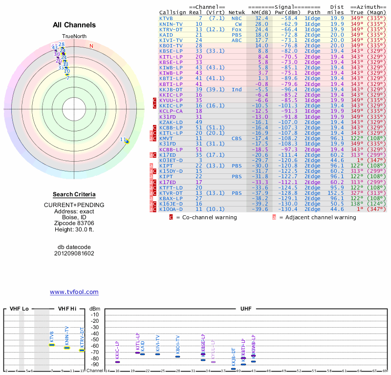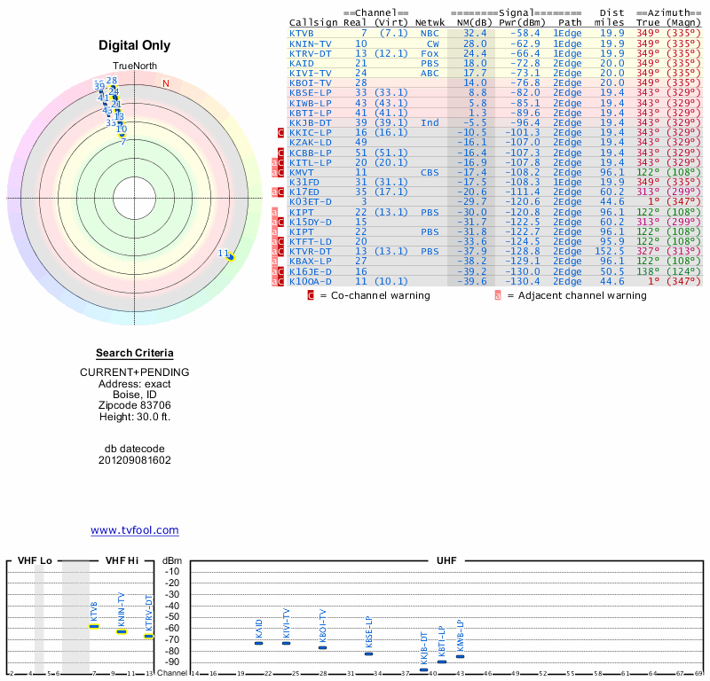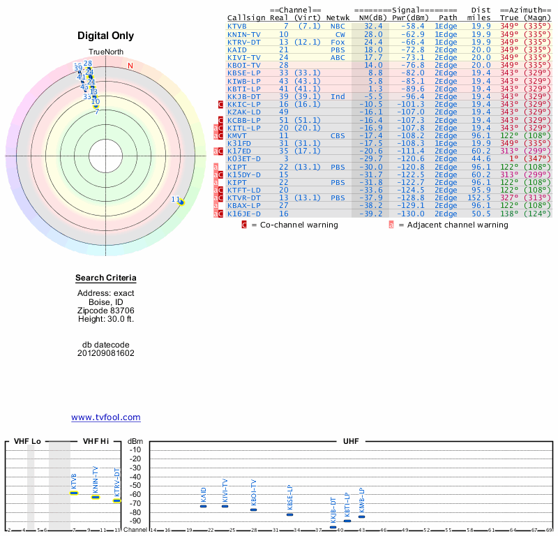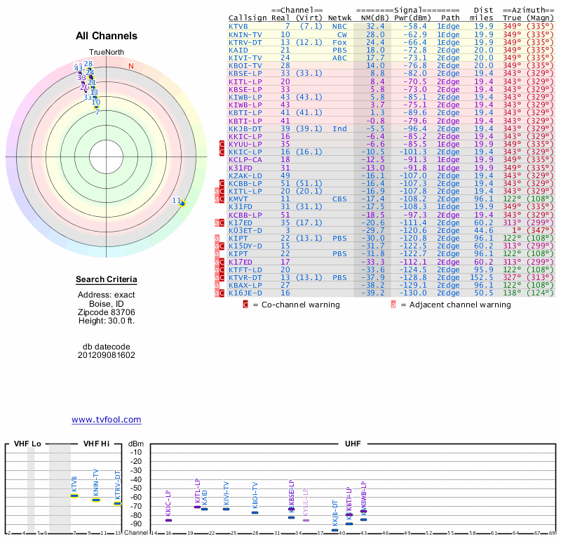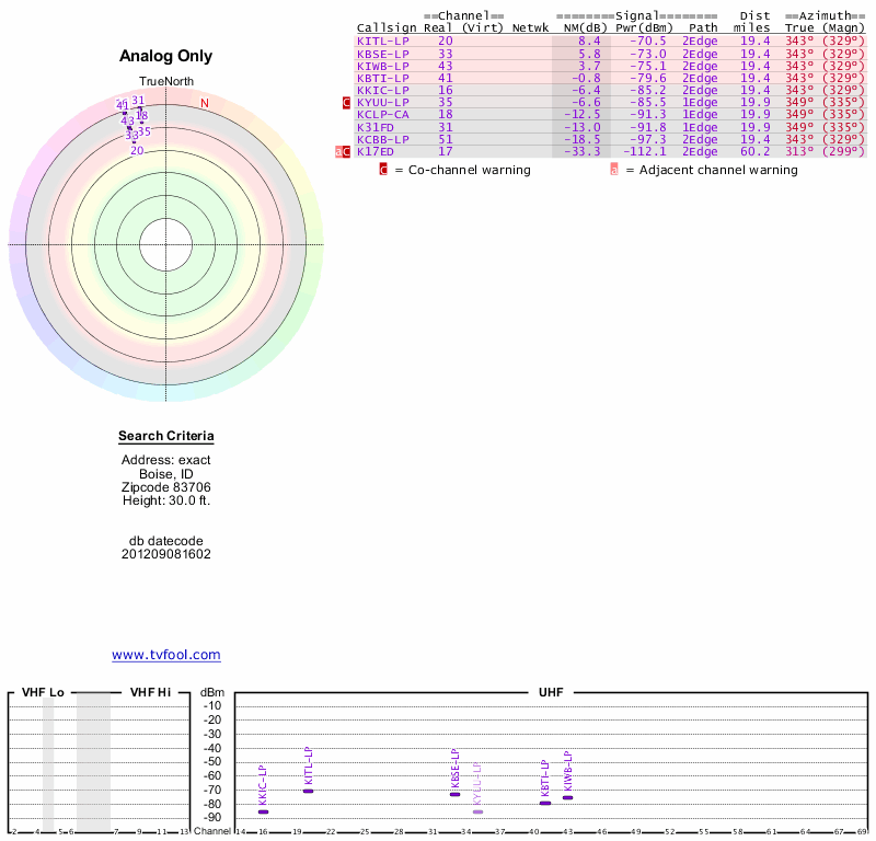 Here are the results for your location. The transmitter database was last updated on June 7, 2013. For more information about these plots and how to interpret them, please check out the Signal Analysis FAQ.