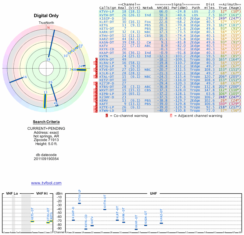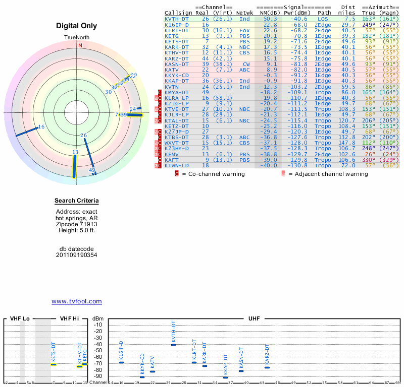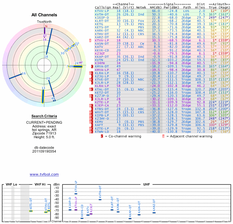 Here are the results for your location. The transmitter database was last updated on June 7, 2013. For more information about these plots and how to interpret them, please check out the Signal Analysis FAQ.