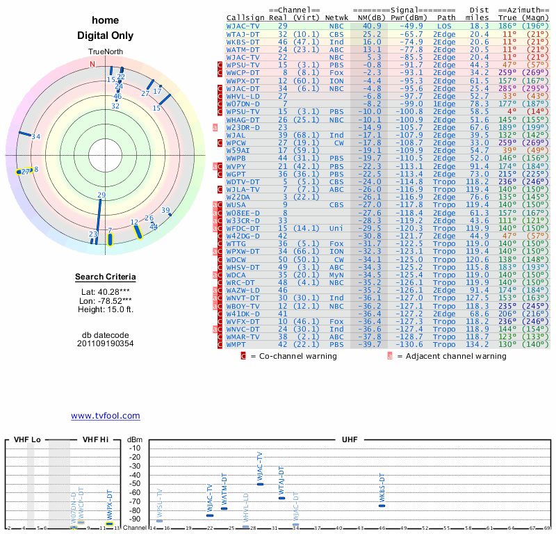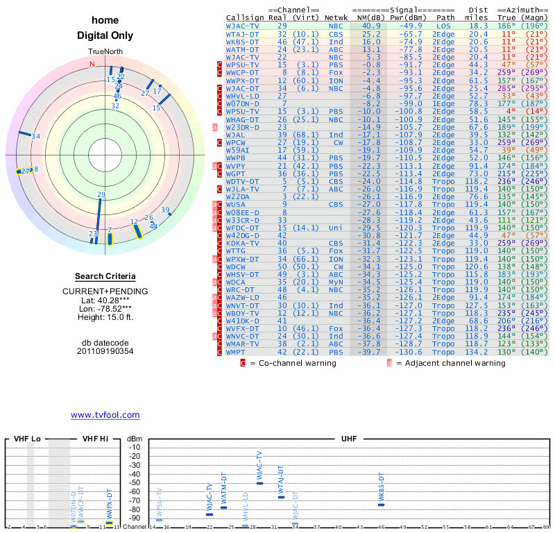 Here are the results for your location. The transmitter database was last updated on June 7, 2013. For more information about these plots and how to interpret them, please check out the Signal Analysis FAQ.