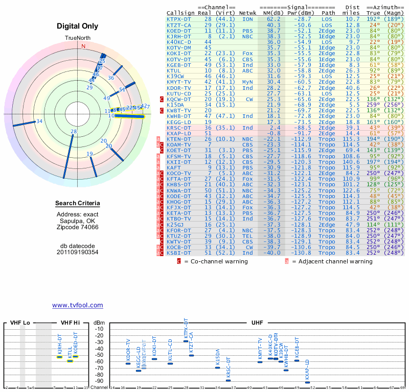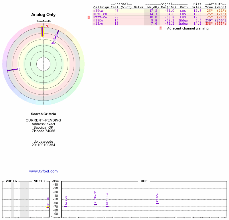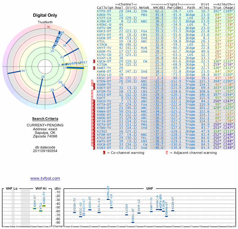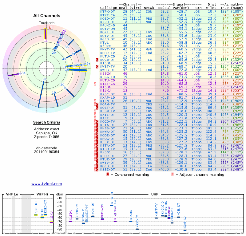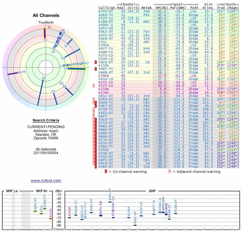 Here are the results for your location. The transmitter database was last updated on June 7, 2013. For more information about these plots and how to interpret them, please check out the Signal Analysis FAQ.