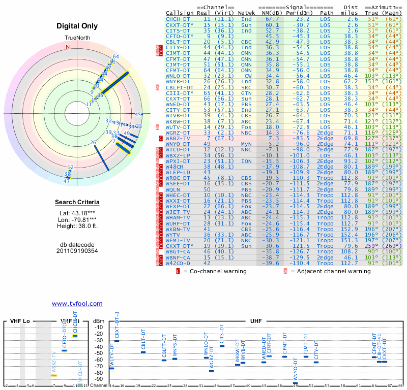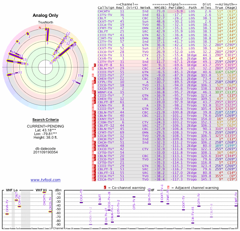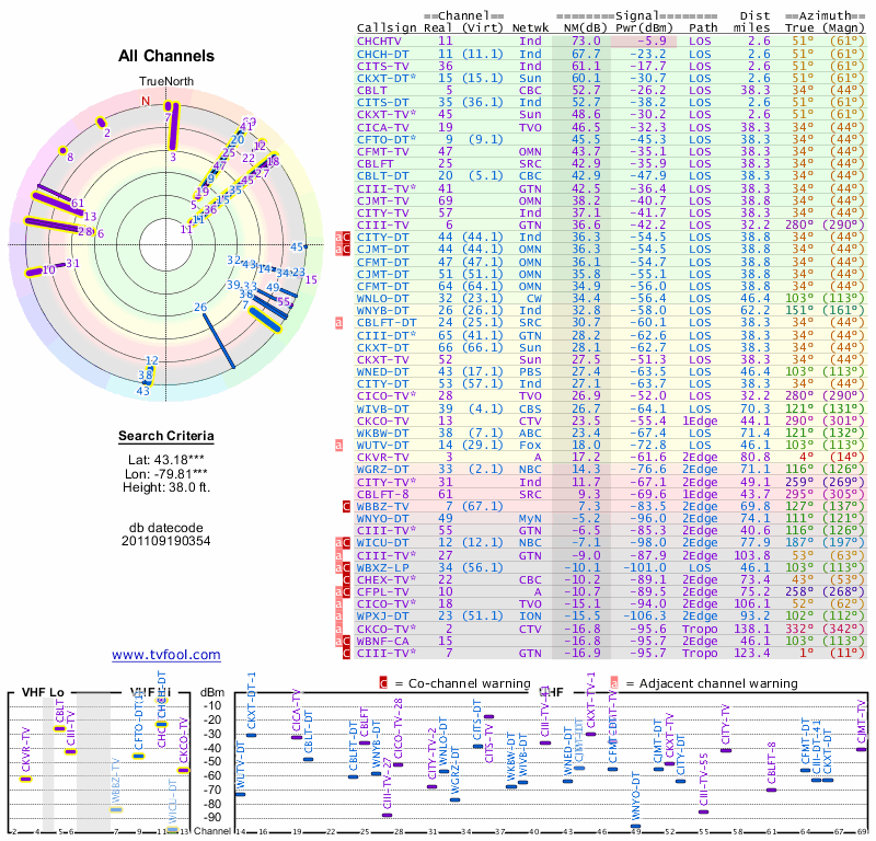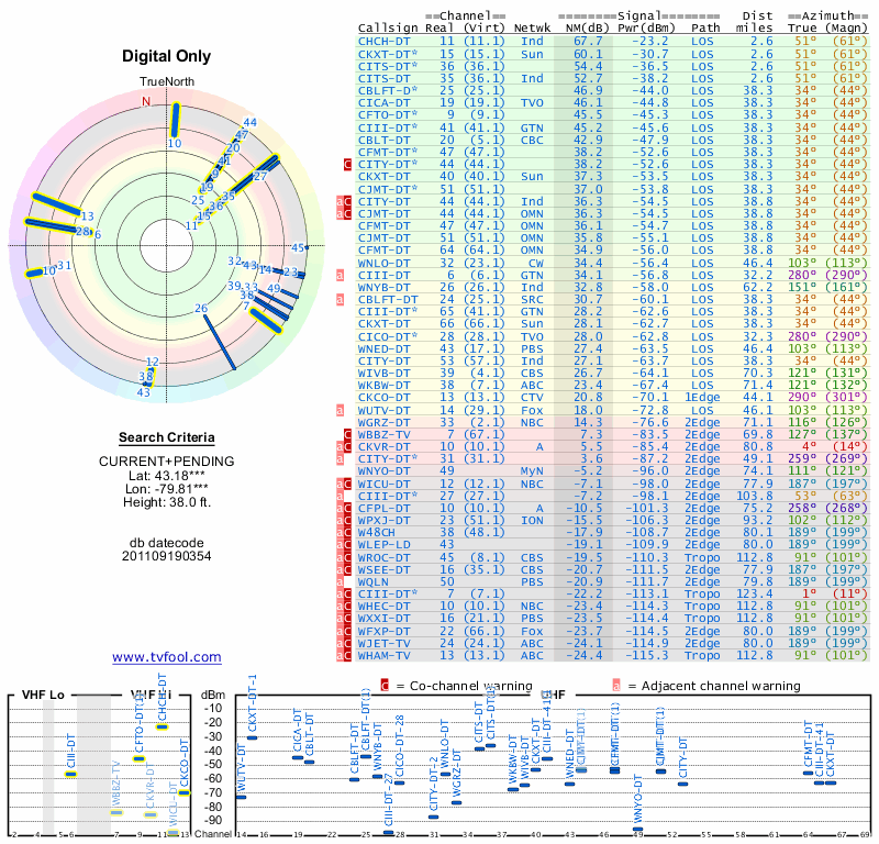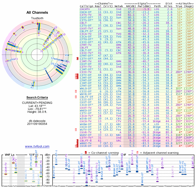 Here are the results for your location. The transmitter database was last updated on June 7, 2013. For more information about these plots and how to interpret them, please check out the Signal Analysis FAQ.