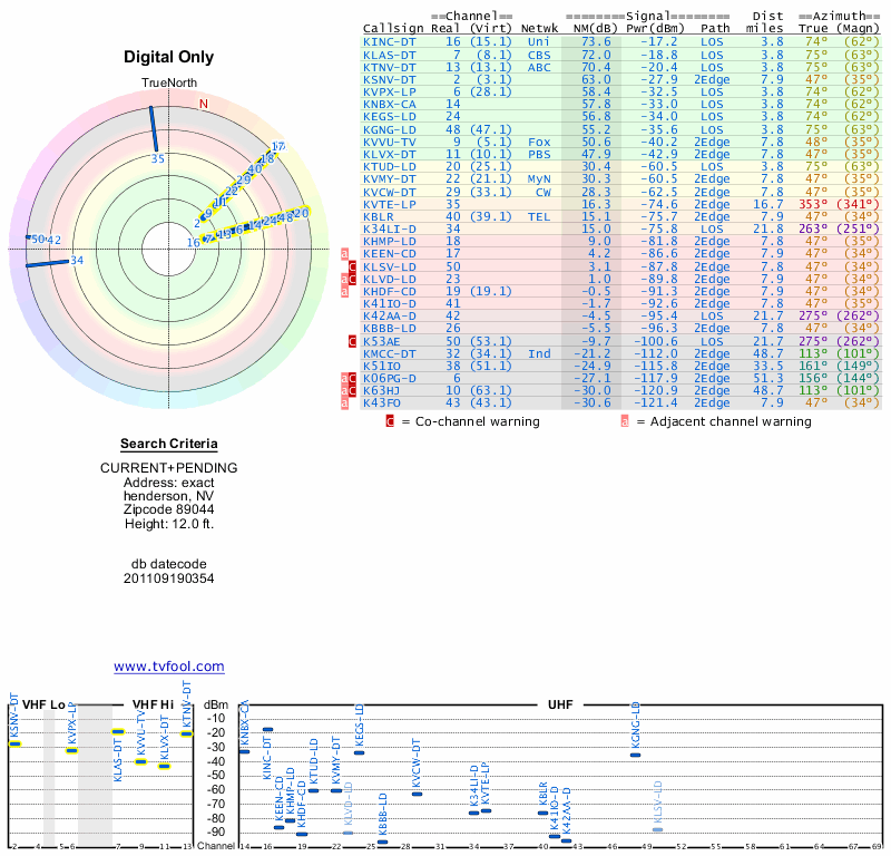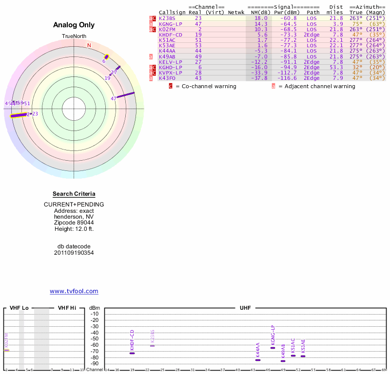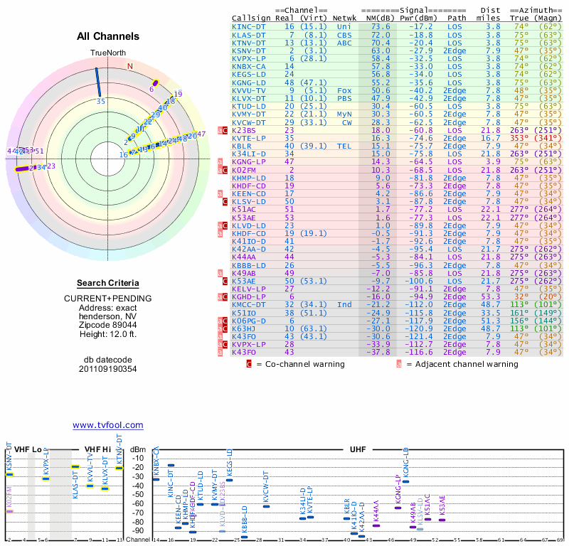 Here are the results for your location. The transmitter database was last updated on June 7, 2013. For more information about these plots and how to interpret them, please check out the Signal Analysis FAQ.