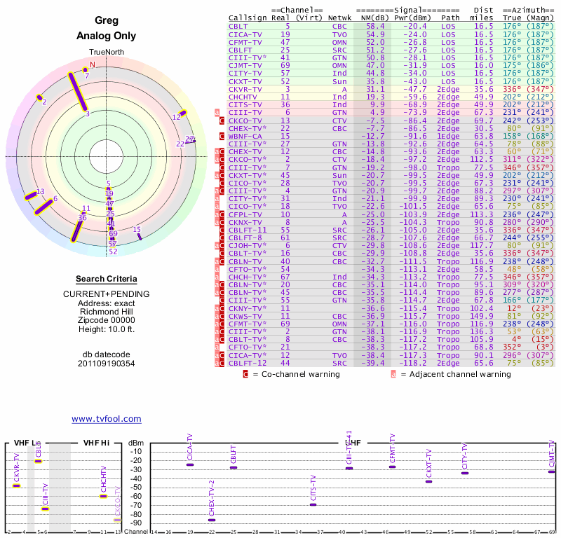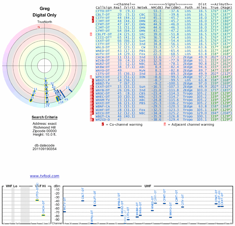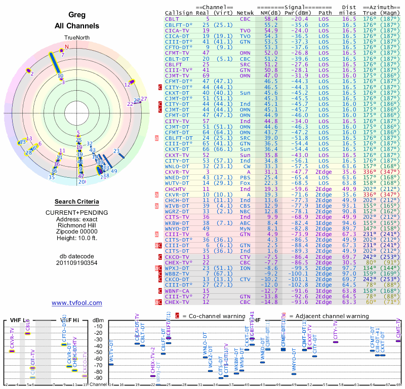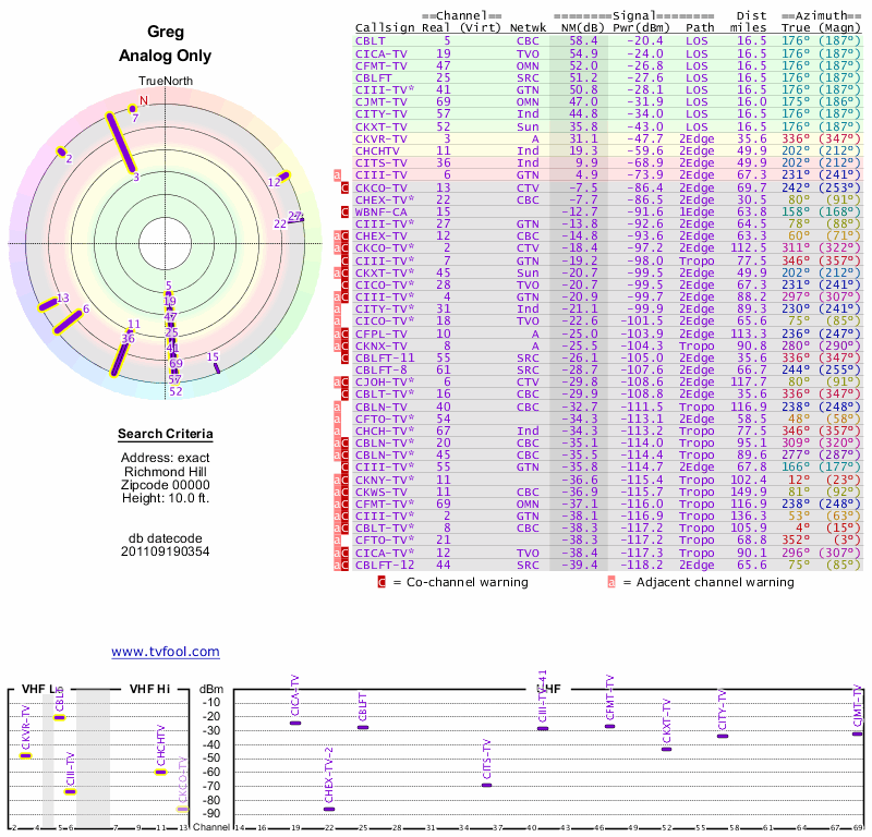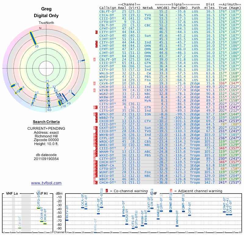 Here are the results for your location. The transmitter database was last updated on June 7, 2013. For more information about these plots and how to interpret them, please check out the Signal Analysis FAQ.