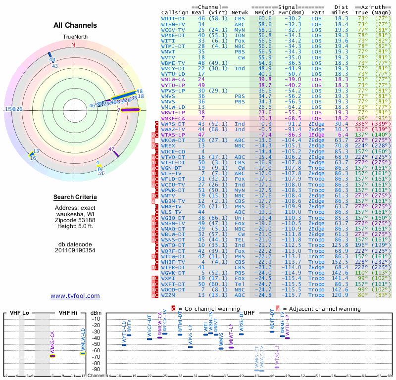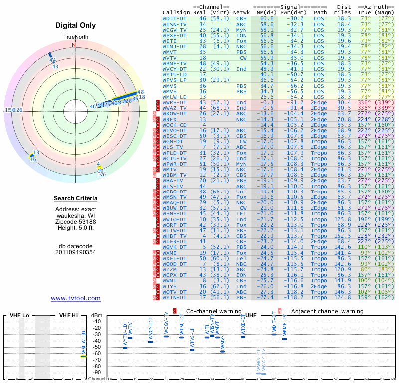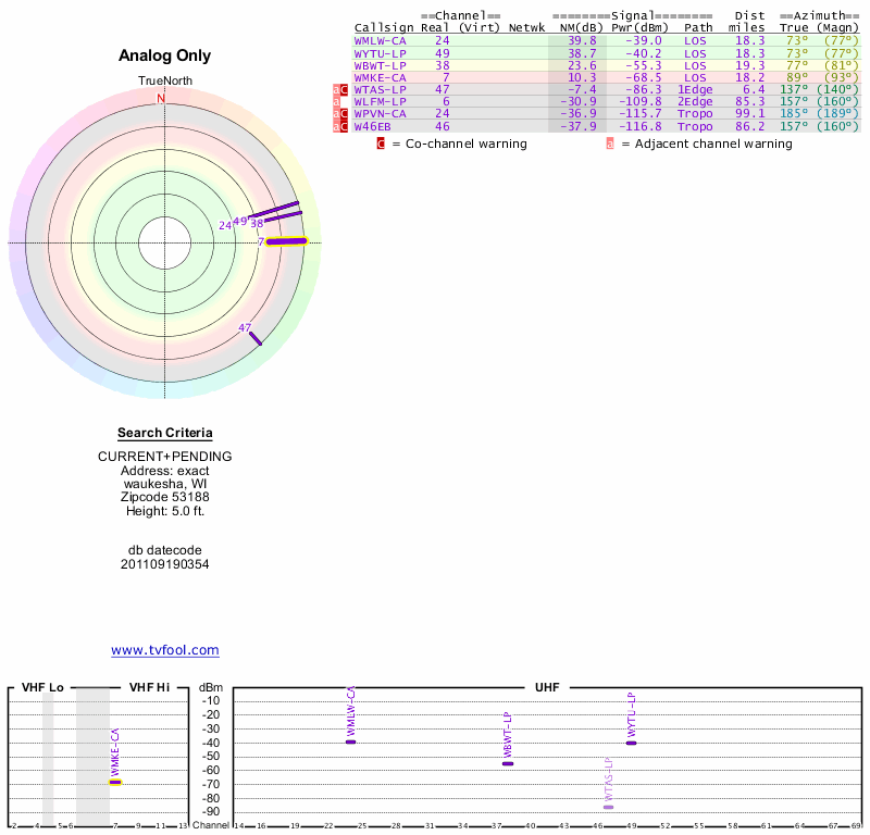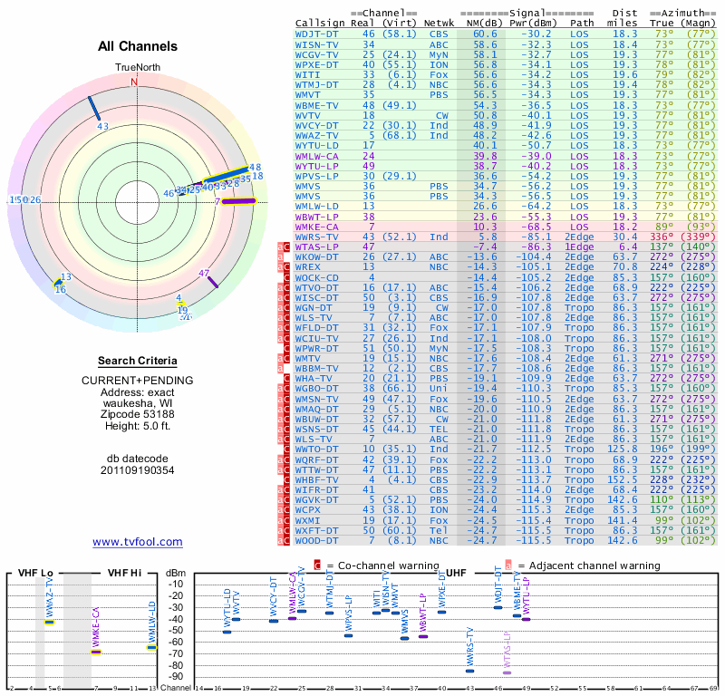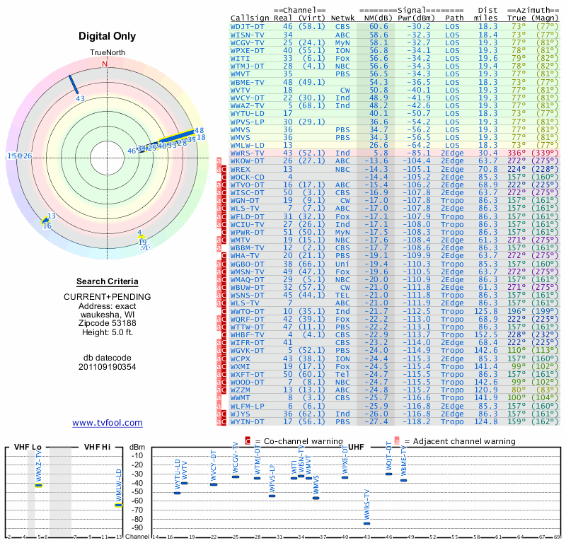 Here are the results for your location. The transmitter database was last updated on June 7, 2013. For more information about these plots and how to interpret them, please check out the Signal Analysis FAQ.