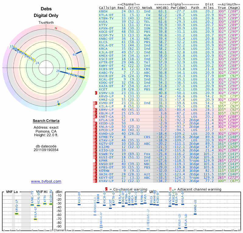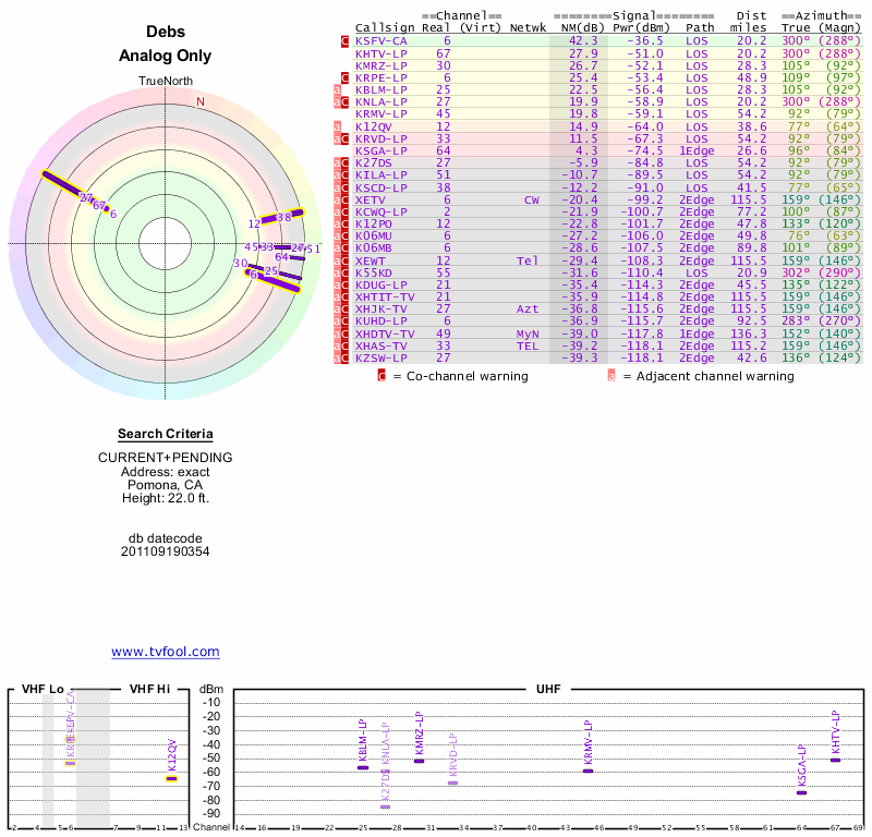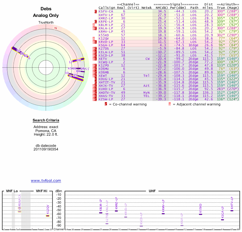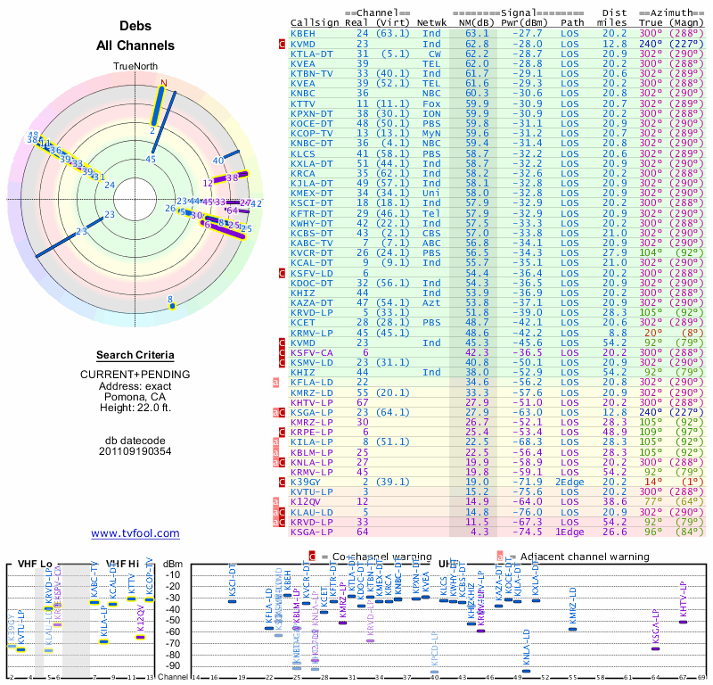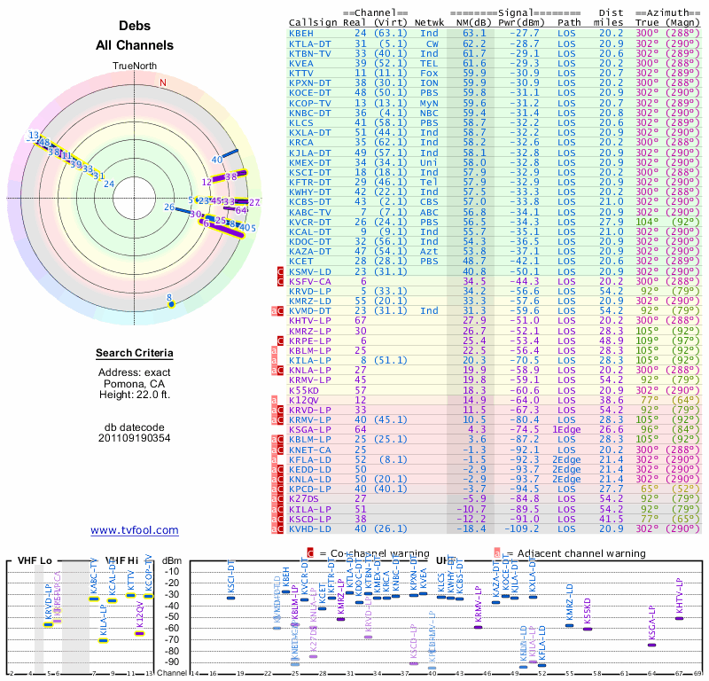 Here are the results for your location. The transmitter database was last updated on June 7, 2013. For more information about these plots and how to interpret them, please check out the Signal Analysis FAQ.