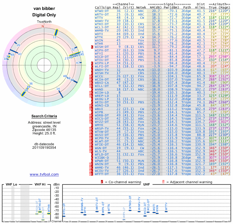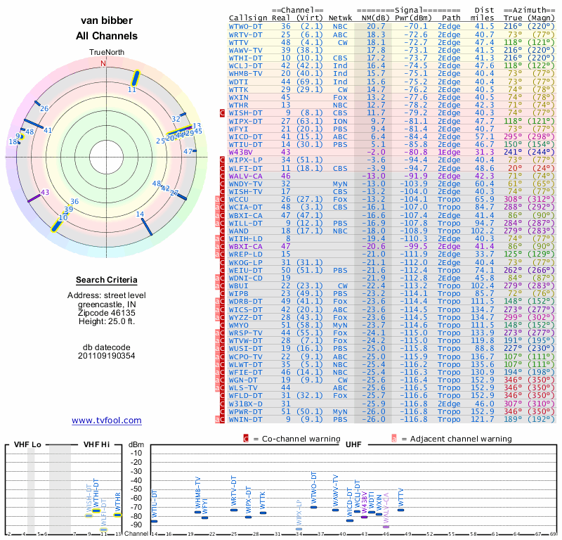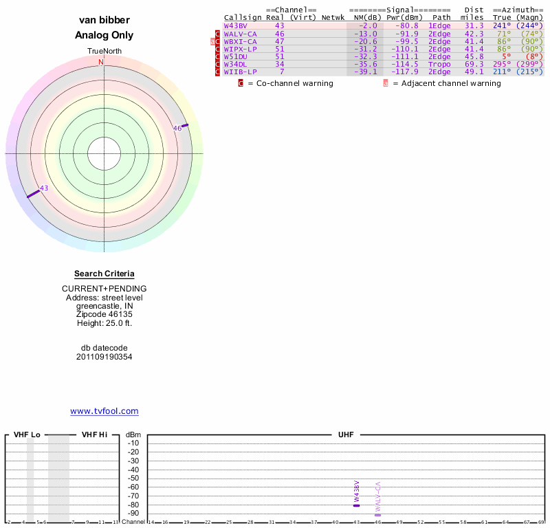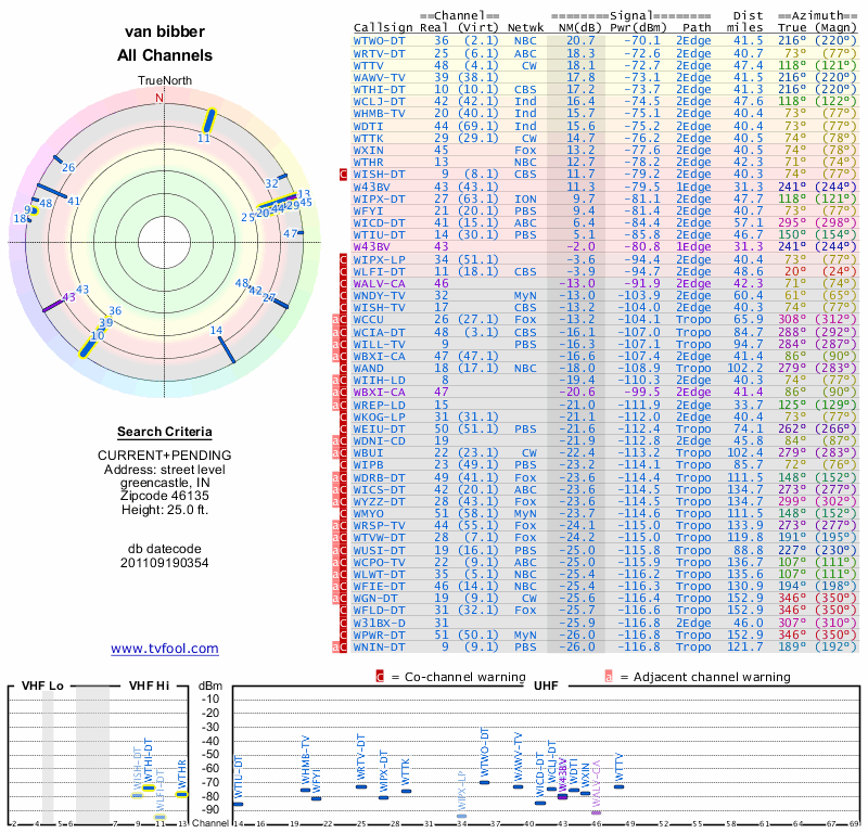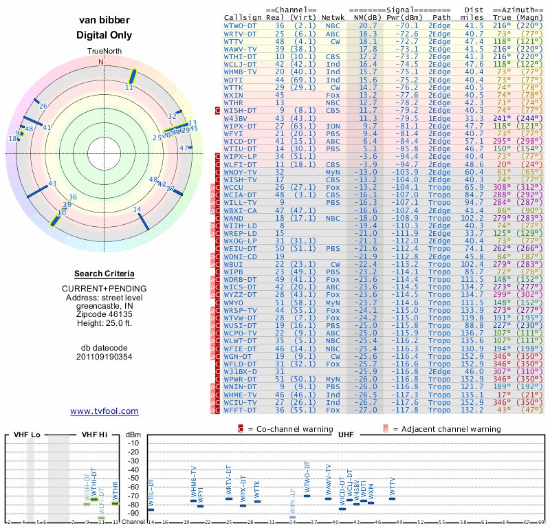 Here are the results for your location. The transmitter database was last updated on June 7, 2013. For more information about these plots and how to interpret them, please check out the Signal Analysis FAQ.