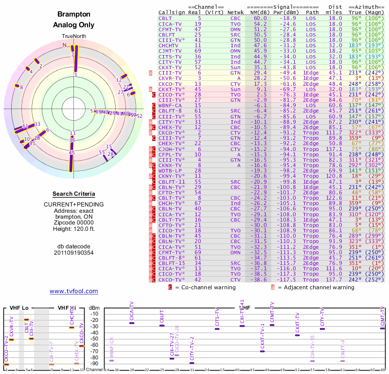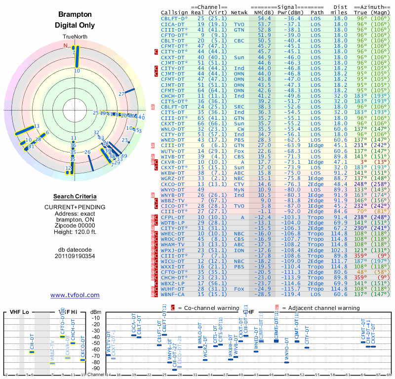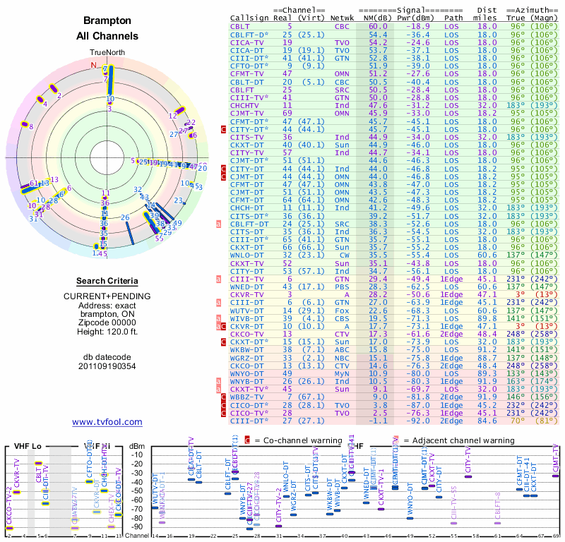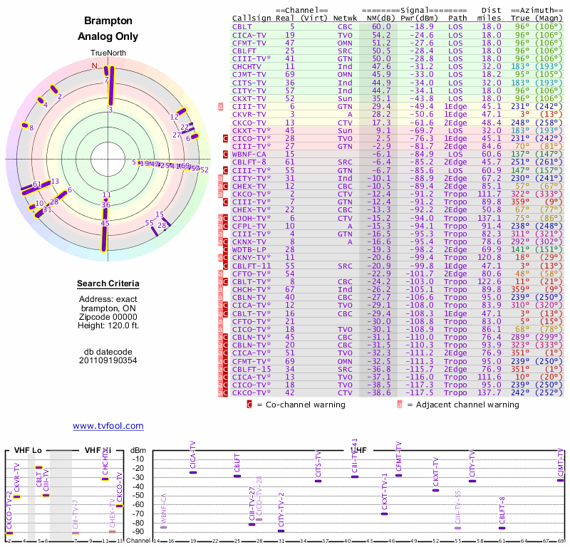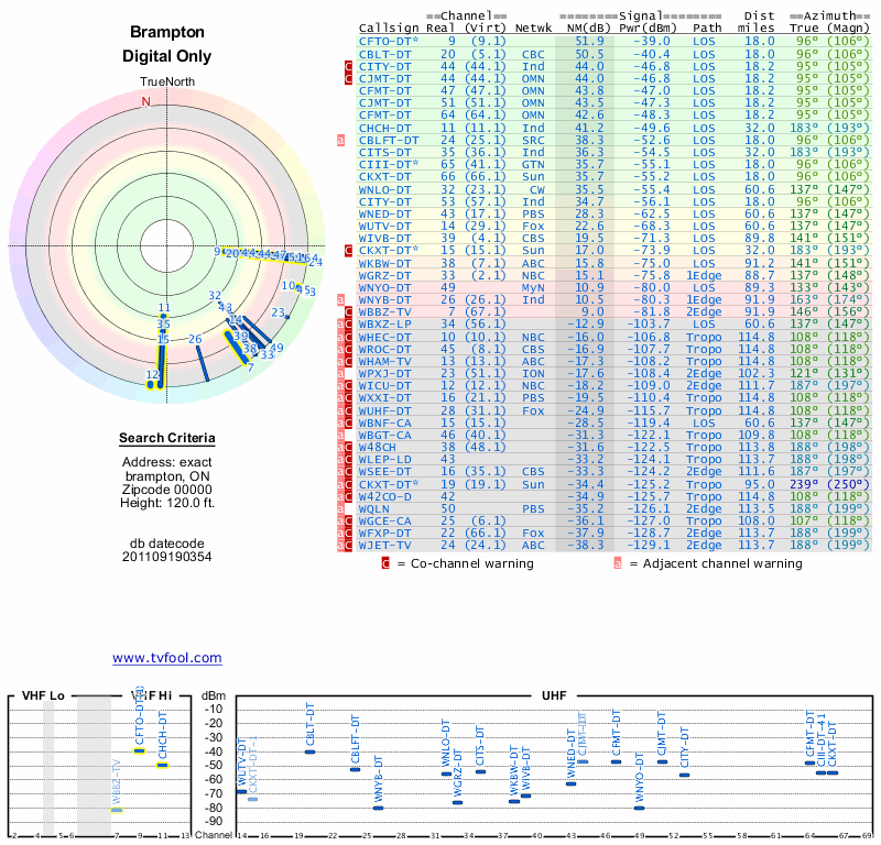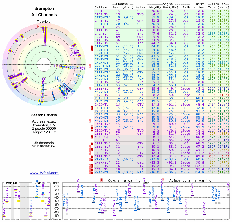 Here are the results for your location. The transmitter database was last updated on June 7, 2013. For more information about these plots and how to interpret them, please check out the Signal Analysis FAQ.